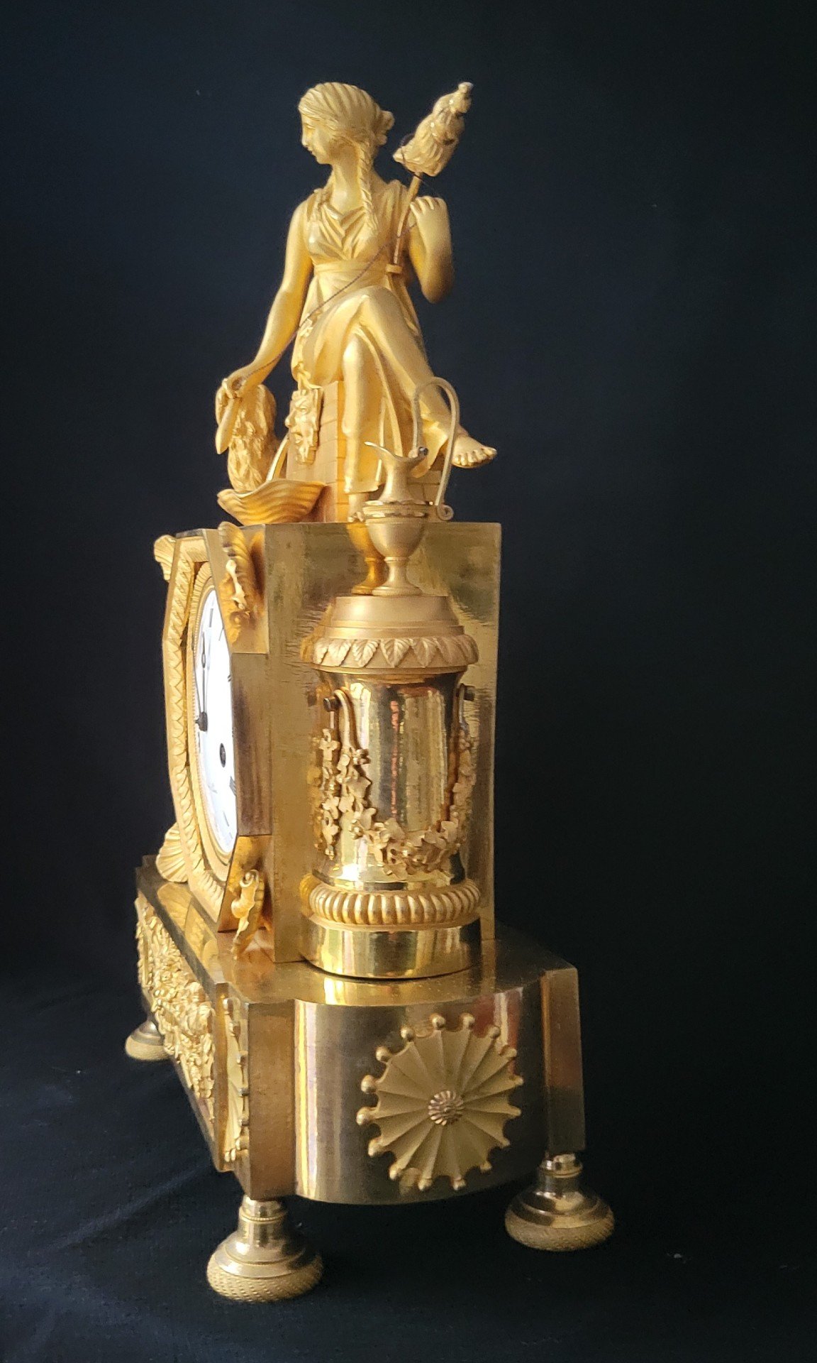 Pendule en bronze doré au mercure en mat et brillant. Elle représente la fileuse. Il s’agirait de la représentation mythologique de CLOTHO appelée « la fileuse », fille de Zeus, déesse de la destinée, tisseuse du fil de la vie.