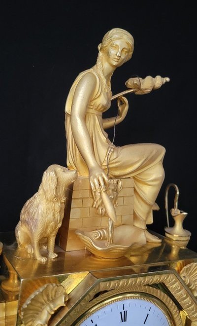 La fileuse, tenant une quenouille à la main, est assise sur une fontaine en pierre à coté d’un chien. Le tout est flanqué de chaque côté d’une aiguière reposant sur une demi-colonne, décorée de guirlande de fleurs, collée surune borne. La base est ornée d’un panier fleuri, d’une couronne, d’une quenouille et de rubans. La pendule repose sur 4 grands pieds.