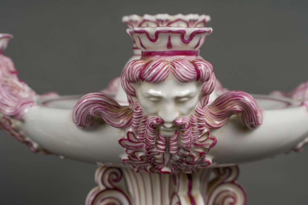 Voici une paire de flambeaux exceptionnels, ils sont en porcelaine et portent un monogramme. Ils sont d'inspiration Restauration, décor de cariatides, de colonnes, de chapiteaux corinthiens.