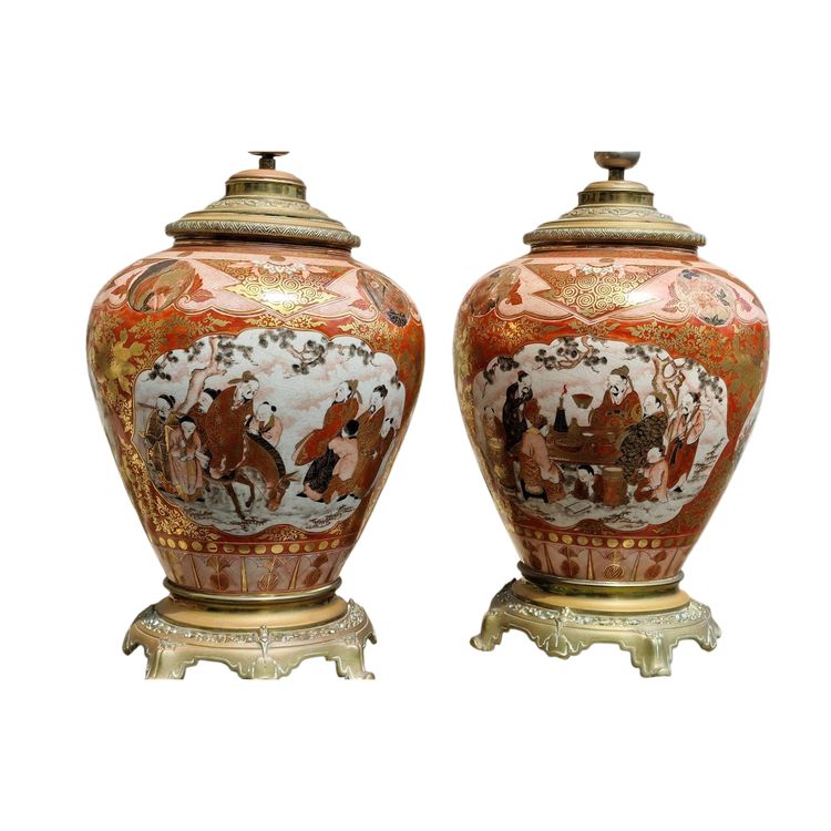 Paire De Lampes Japonaises En Porcelaine De Kutani Blanc Rouge Et Or Monture Japonisante Vase