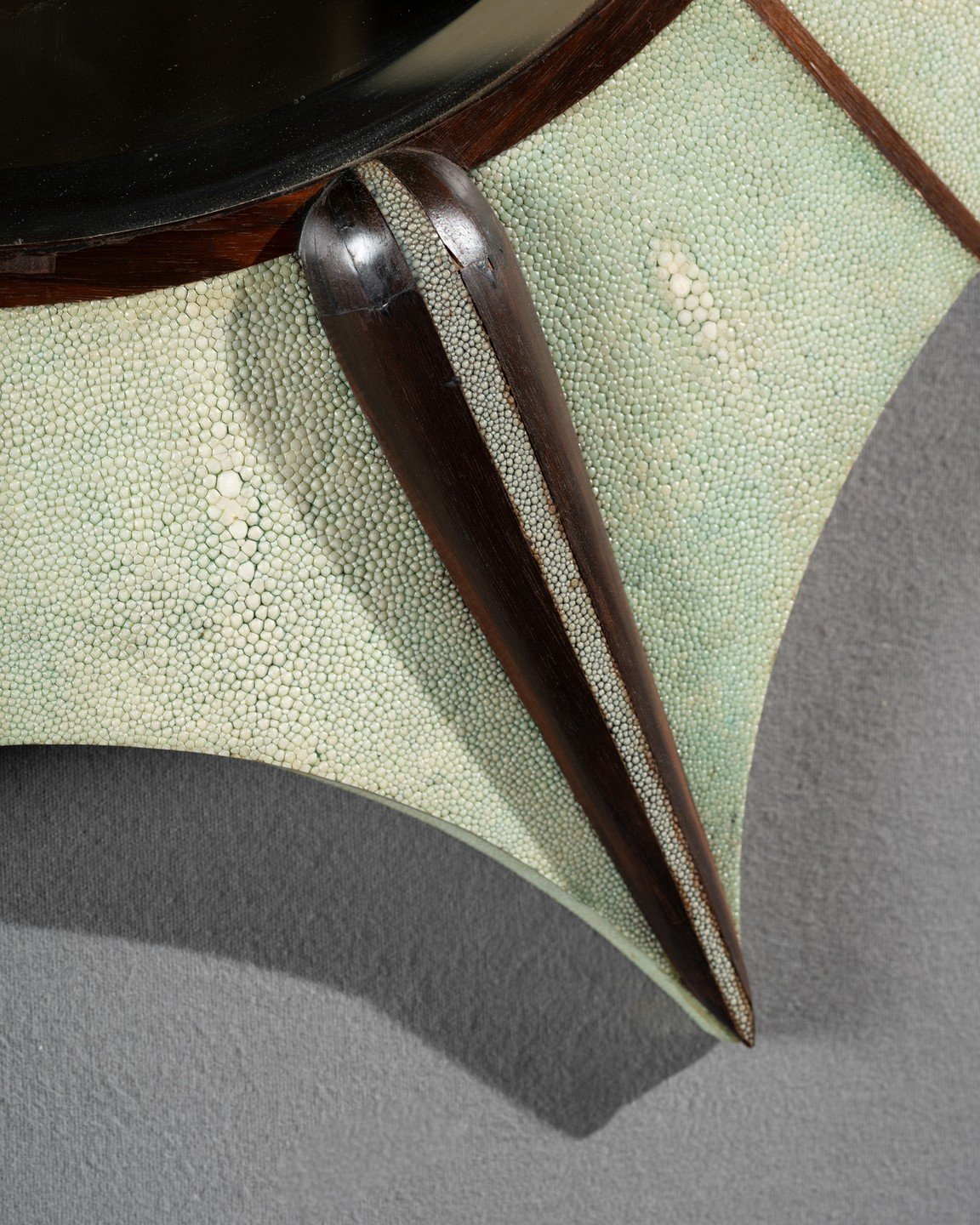 Teintés couleur jade, des belles pièces de galuchat sont tendues sur une âme de bois. Des arêtes de bois exotique, comme des dorsales de requin, donnent du volume à ce miroir aux lignes modernistes. Le verre biseauté ajoute une touche de raffinement à cet objet qui puise aussi bien dans les lignes de son époque quand dans les matériaux chers aux arts décoratifs classiques. L’ensemble est en excellent état.
