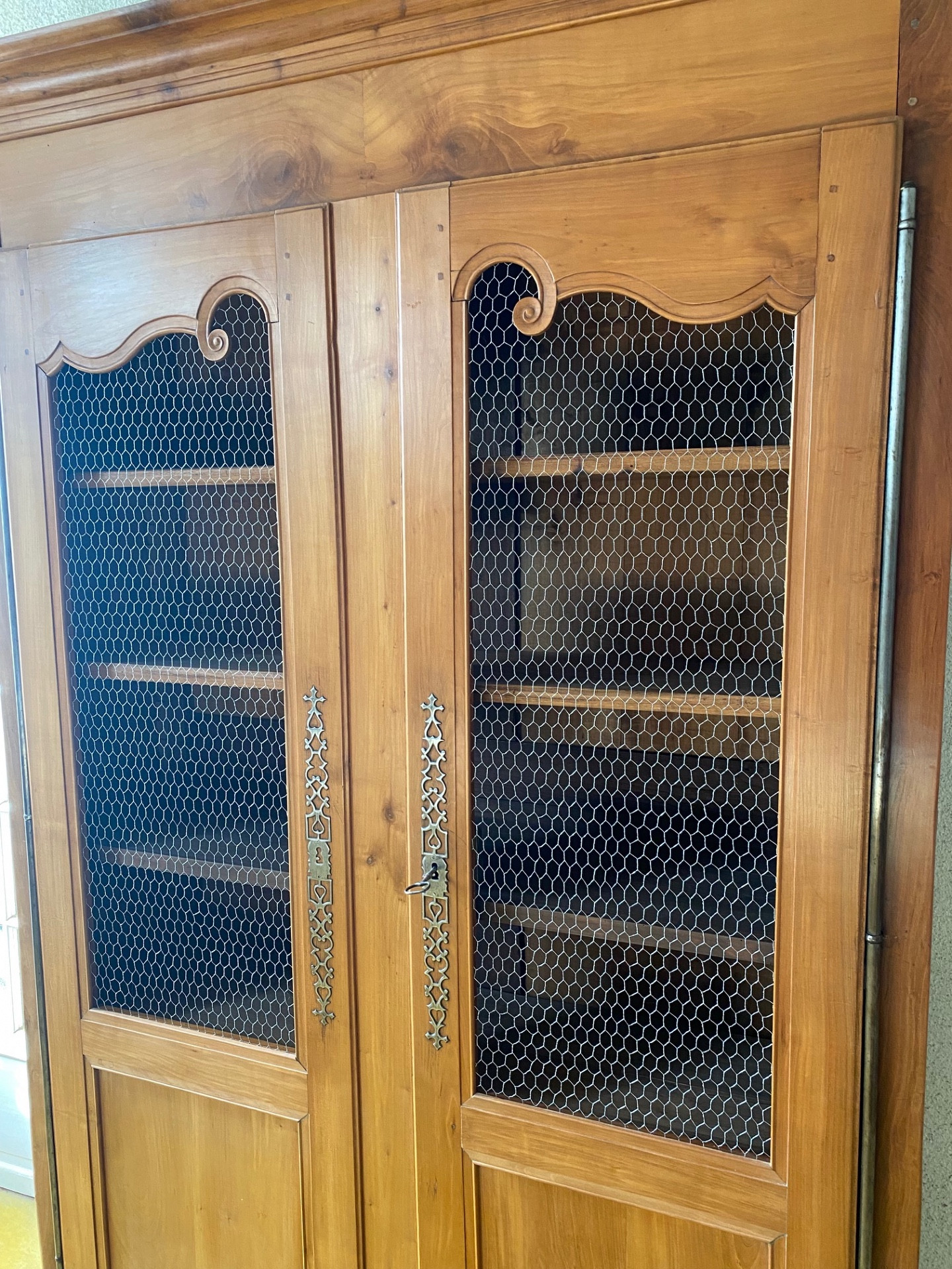 Bibliothèque en merisier fin du XIX ème siècle restaurée et en très bon état / les vitres des portes remplacées par du grillage  / 4 étagères hauteur réglable avec crémaillères /serrure d'origine avec sa clé.