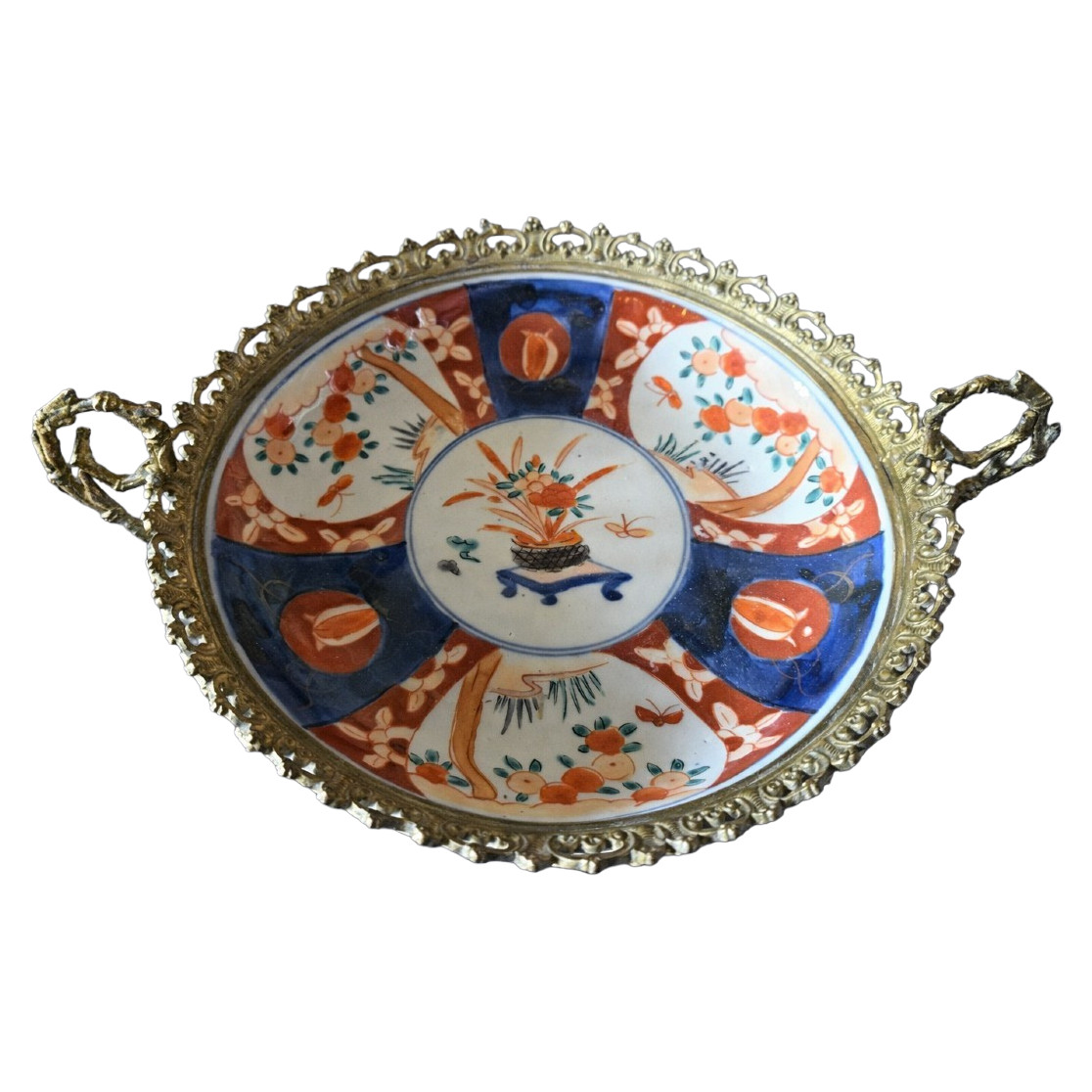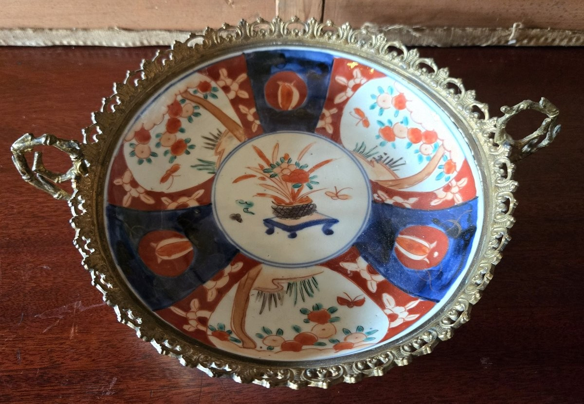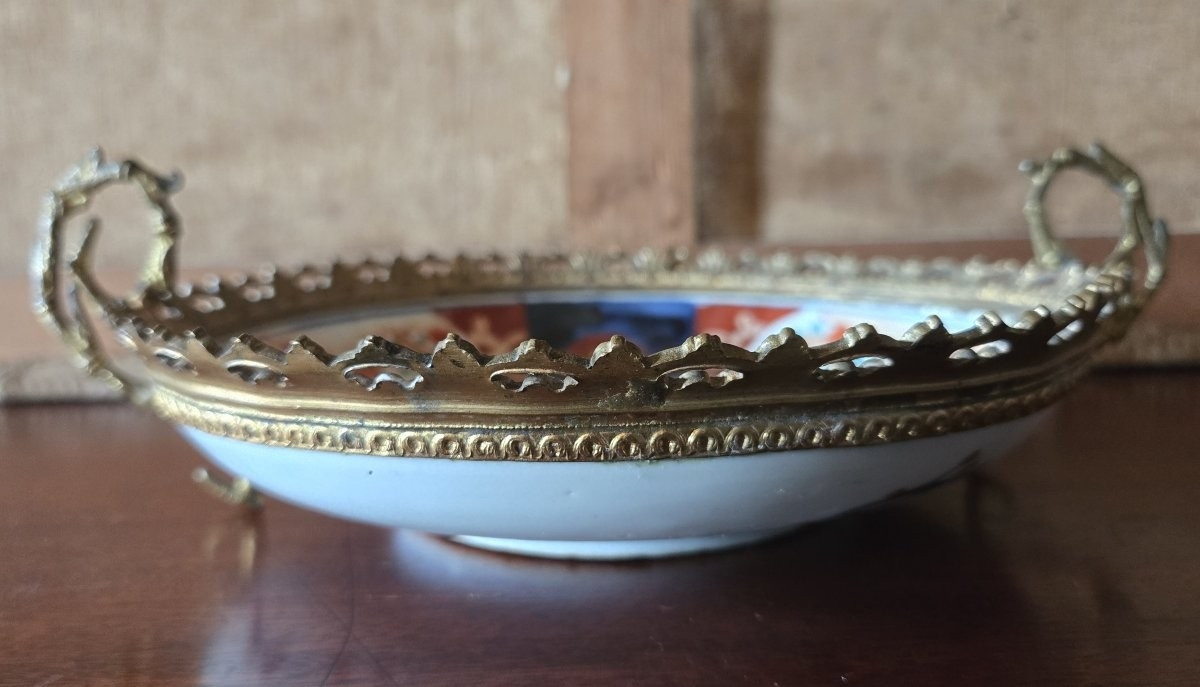 Très élégant plat rond en porcelaine décorée, présenté dans une monture en bronze ajouré à deux prises latérales. Pièce décorative raffinée, idéale en centre de table, sur un buffet ou en vitrine.