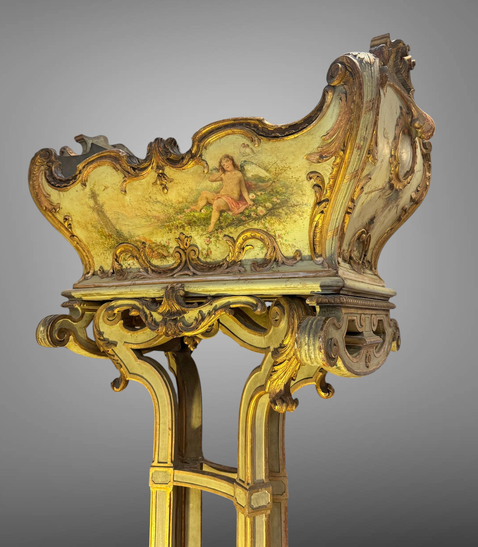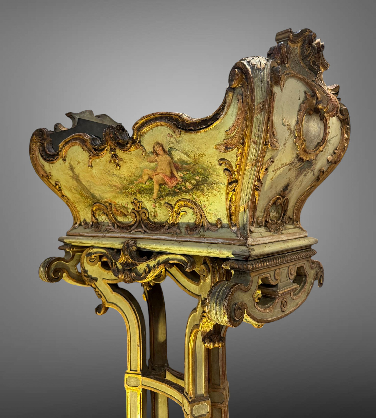 Le corps adopte une forme mouvementée en berceau, typique du goût rocaille du XVIIIe siècle, animé de courbes asymétriques, de coquilles et de rinceaux finement sculptés. Les panneaux sont ornés de scènes peintes à décor champêtre, représentant des putti évoluant dans un paysage bucolique, dans l’esprit des décors galants.