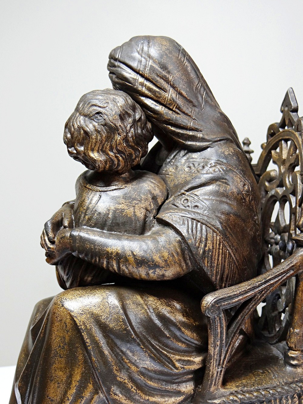 Hauteur environ 21cm, longueur max 22cm, largeur maximale 10cm. État correct d’usage, patine brunie/usée, manque un pied arrière de la chaise (la pièce reste stable grâce au livre arrière), manque à un gros orteil de l’Enfant Jésus, craquelure visible sur la même jambe, autres petits défauts et usures discrets. On note 2 pas de vis sous la base. Environ 1,200kg.