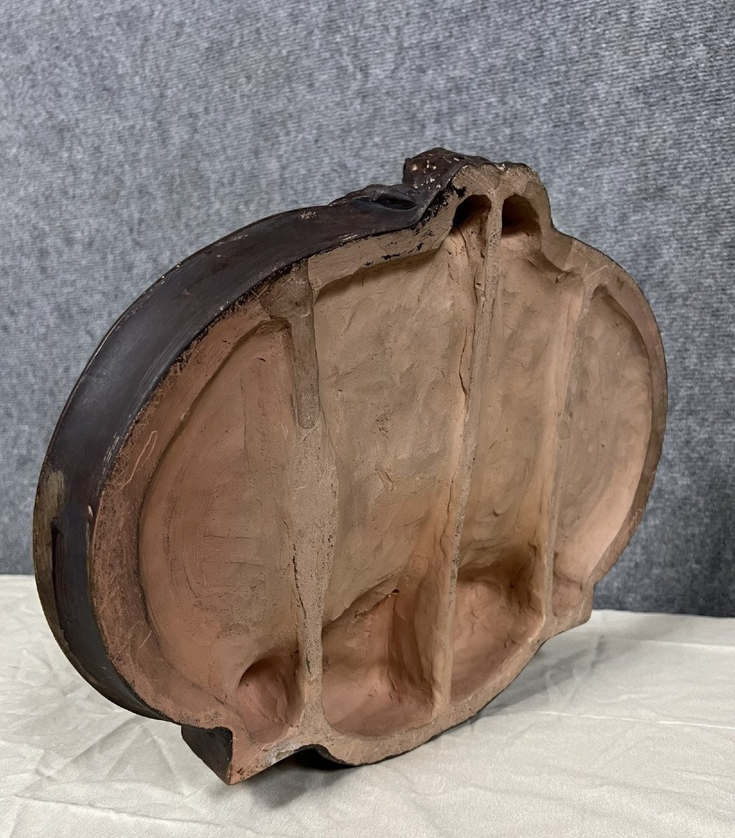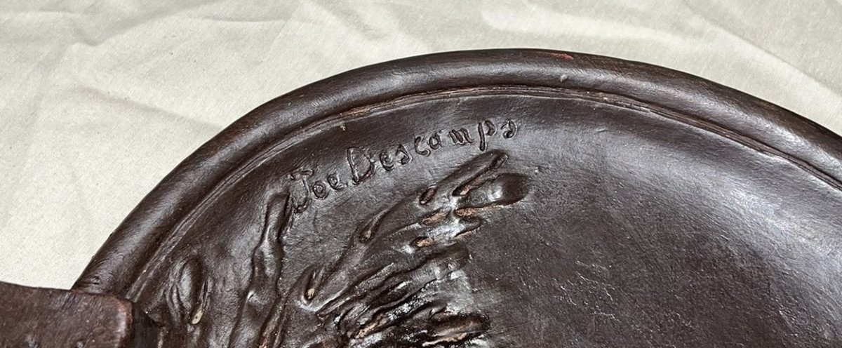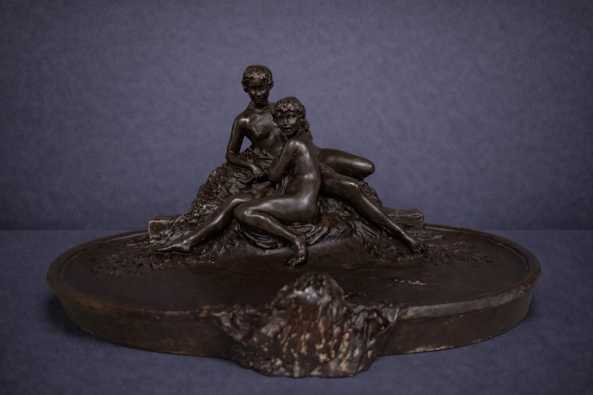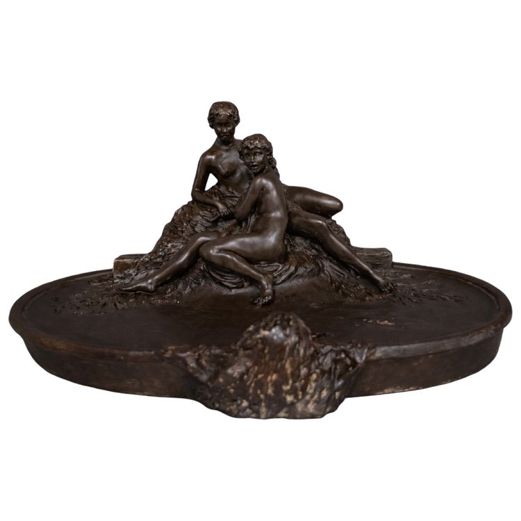 Sculpture ancienne de Joe DESCAMPS (1869 - 1950) : Très grand Vide poche époque Art Nouveau / terre cuite patinée – Scène allégorique de deux figures romantique observées par un personnage satyrique