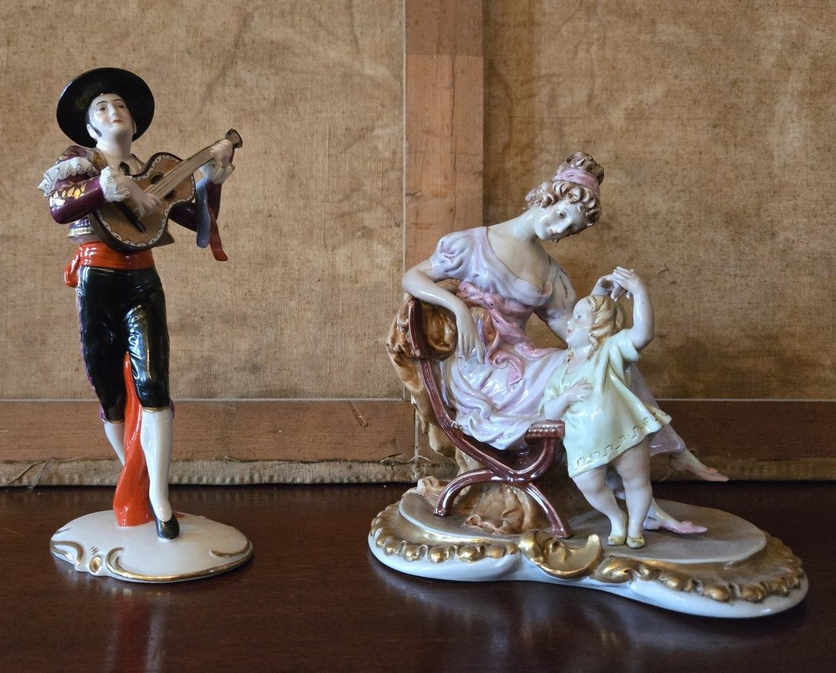 Charmant ensemble en porcelaine émaillée polychrome composé de deux sujets décoratifs dans l’esprit galant et romantique.