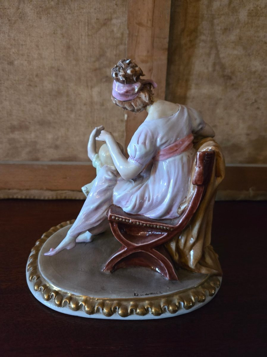Scène tendre représentant une jeune femme élégamment vêtue, assise sur un fauteuil de style Louis XV, accompagnée d’un enfant.