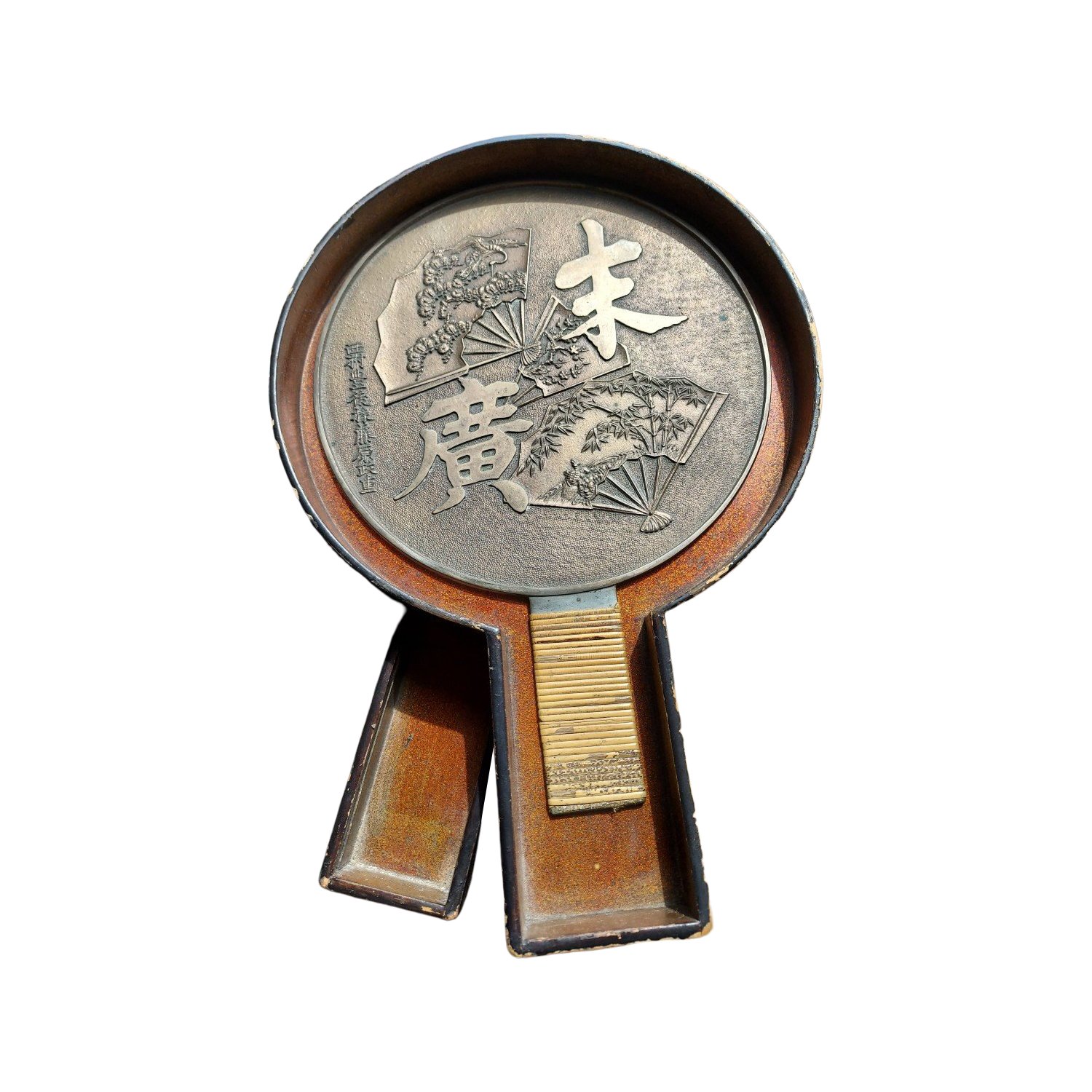 Beau Kagami, miroir japonais datant de l'époque Meïji (1852-1912). Il est accompagné de son étui en laque. Le miroir est en bon état, l'étui en laque est légèrement abîmé sur la partie externe. Les dimensions indiquées sont celles de l'etui. Le miroir mesure 33 x 23,5 cm