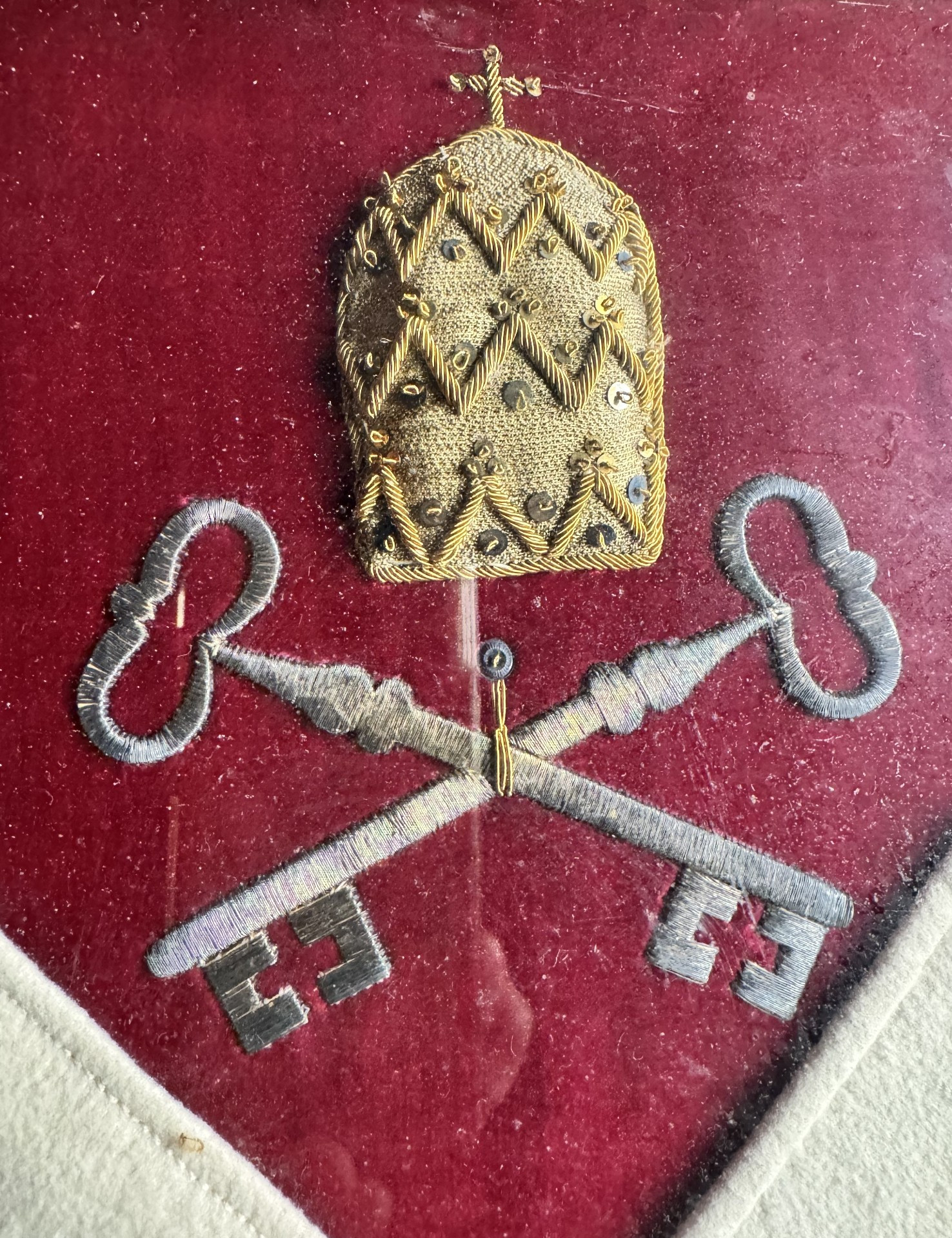 Est ainsi présenté, un grand fragment de la ceinture de soutane du pontife en flanelle blanche, légende brodée en cannetille or, surmontée des armoiries du Vatican. Les clés brodées en guipure argent, la tiare en drap d'or rembourré, cannetille et paillettes. Dans un cadre en bois doré de 38 cm sur 30.