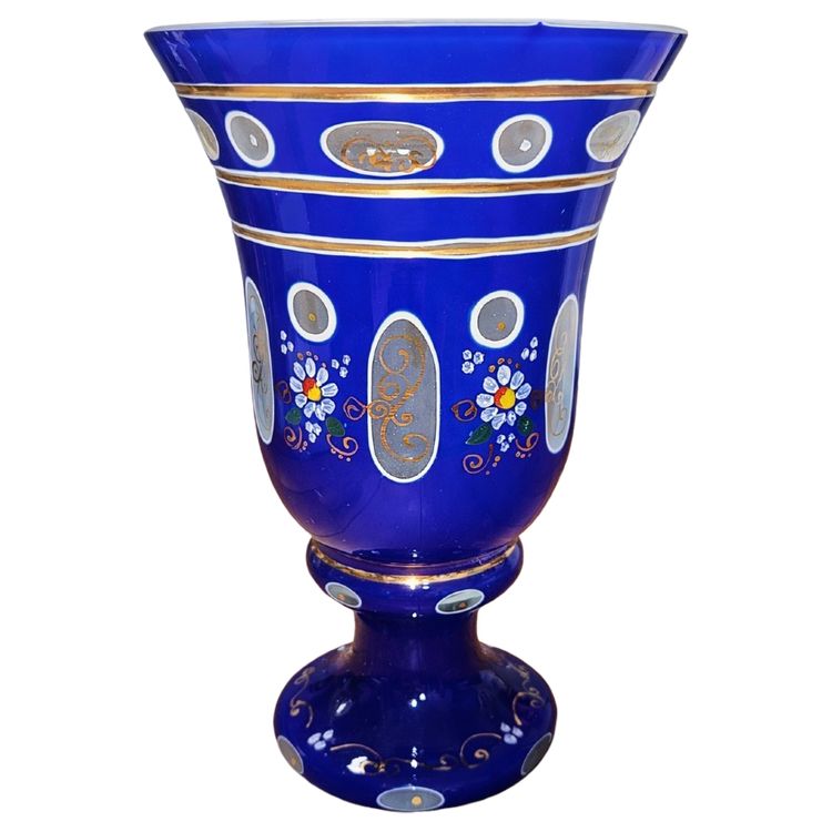 Grand calice en verre bleu émaillé (verre bohème XXe siecle)