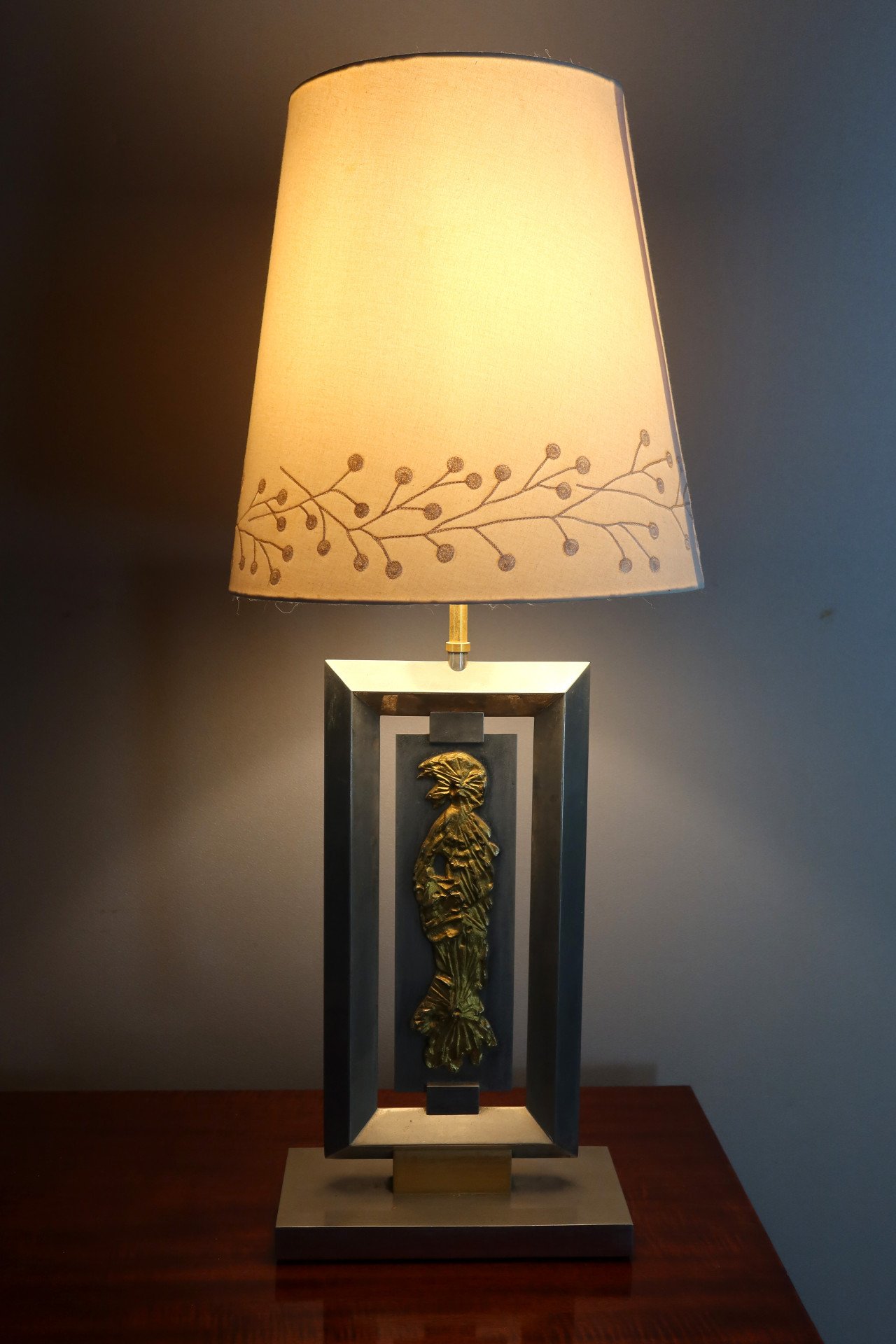 Baguès auf einem Schild auf der Rückseite einer der beiden Lampen. Die Lampen haben Lampenschirme in Ecru und sind bestickt.