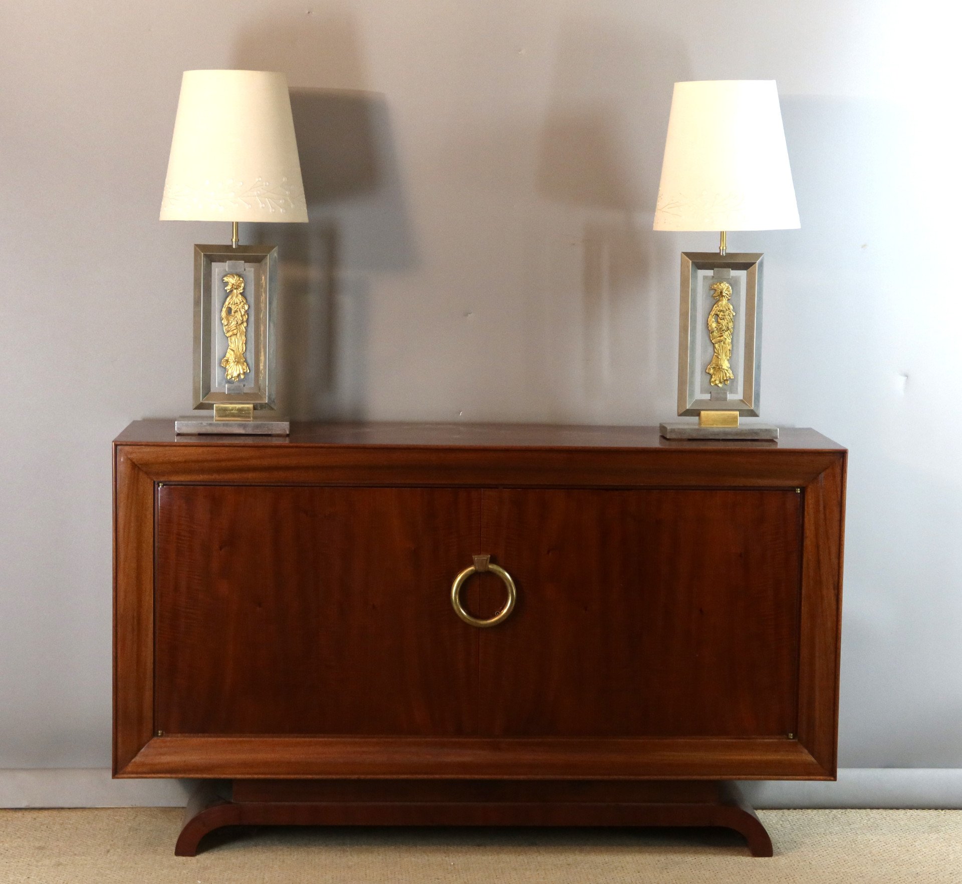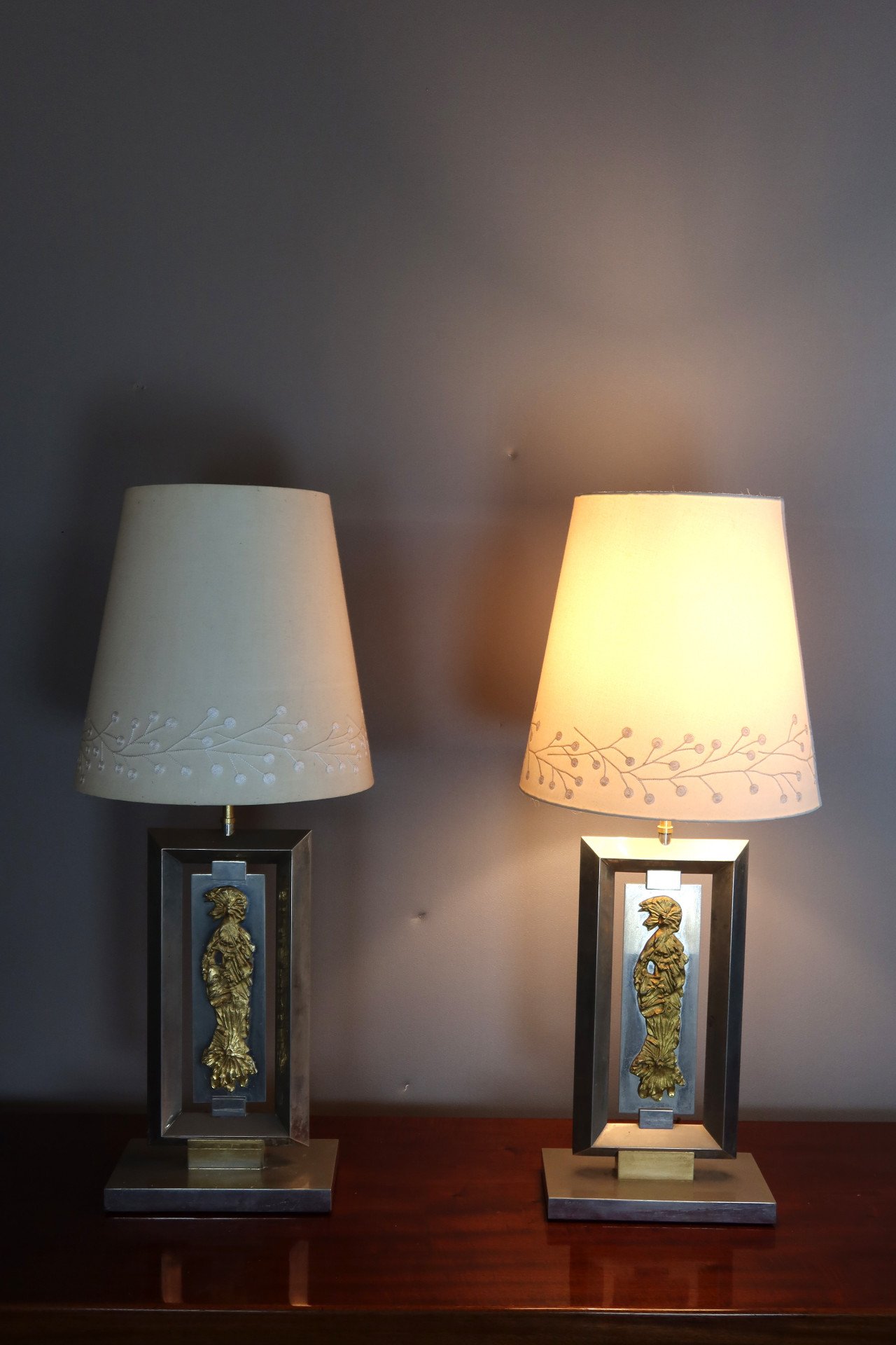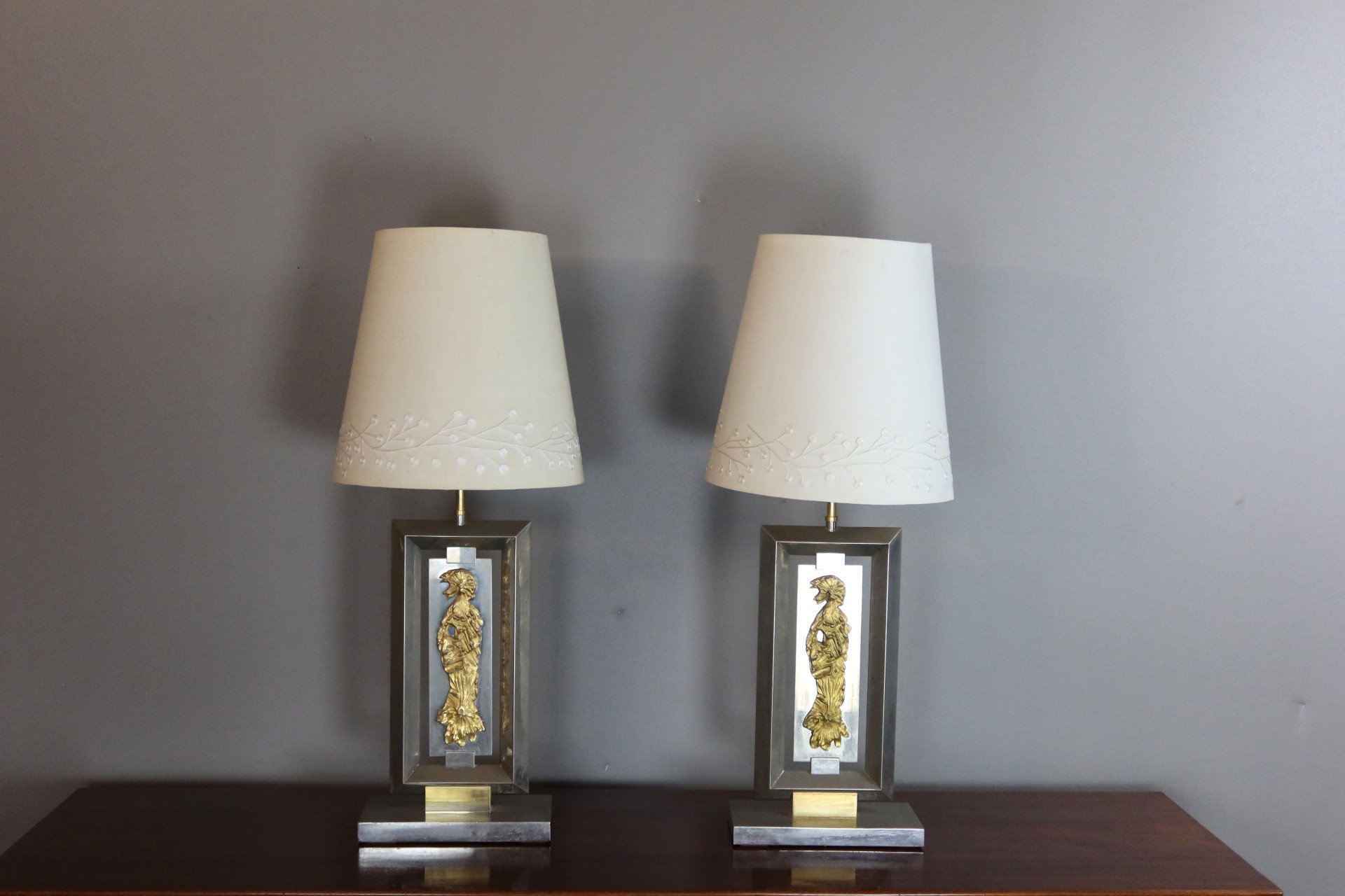 Ein Paar Lampen aus verchromtem Metall, die auf der Vorderseite mit einer stilisierten Frau verziert sind. Signatur des Hauses