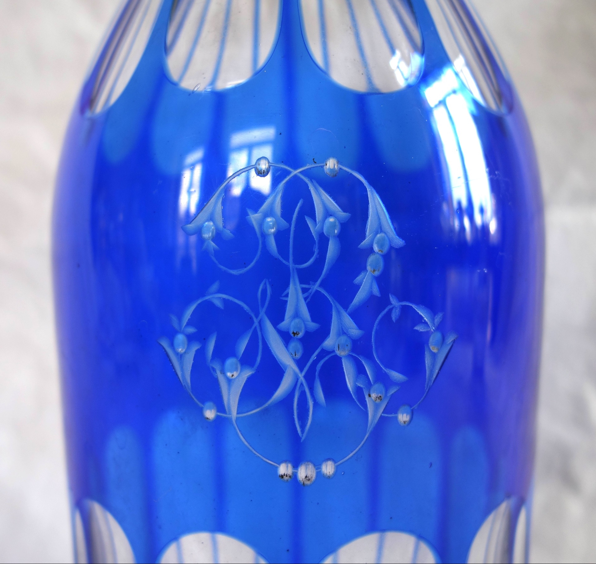 Karaffe oder Phantasieflasche aus Baccarat-Kristall mit blauem Overlay, Ende des 19. Jahrhunderts, ca. 1880-1900. Unter Overlay versteht man ein mehrschichtiges Kristall, weißes Kristall, das mit einer dünnen Schicht farbigen Kristalls bedeckt ist, die nach dem Schleifen das Weiß durchscheinen lässt. Luxusproduktion, die für ihren Besitzer mit einem RV-Monogramm personalisiert wurde.