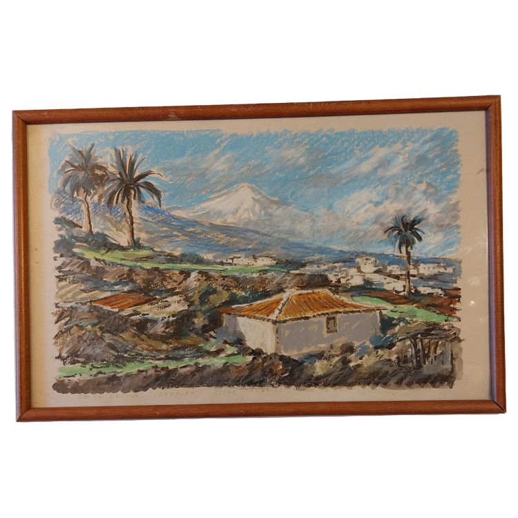 Edmond Melot, peintre, était aussi chef lissier et tapissier maitre de la Manufacture des Gobelins à Paris - Parmi son travail, des tapisseries de Chagall -Ici un pastel représentant Santa Ursula à Tenerife, aux Iles Canaries avec le mont Teide au fond - format: 25 x 40 cm - signé et daté 1978 -