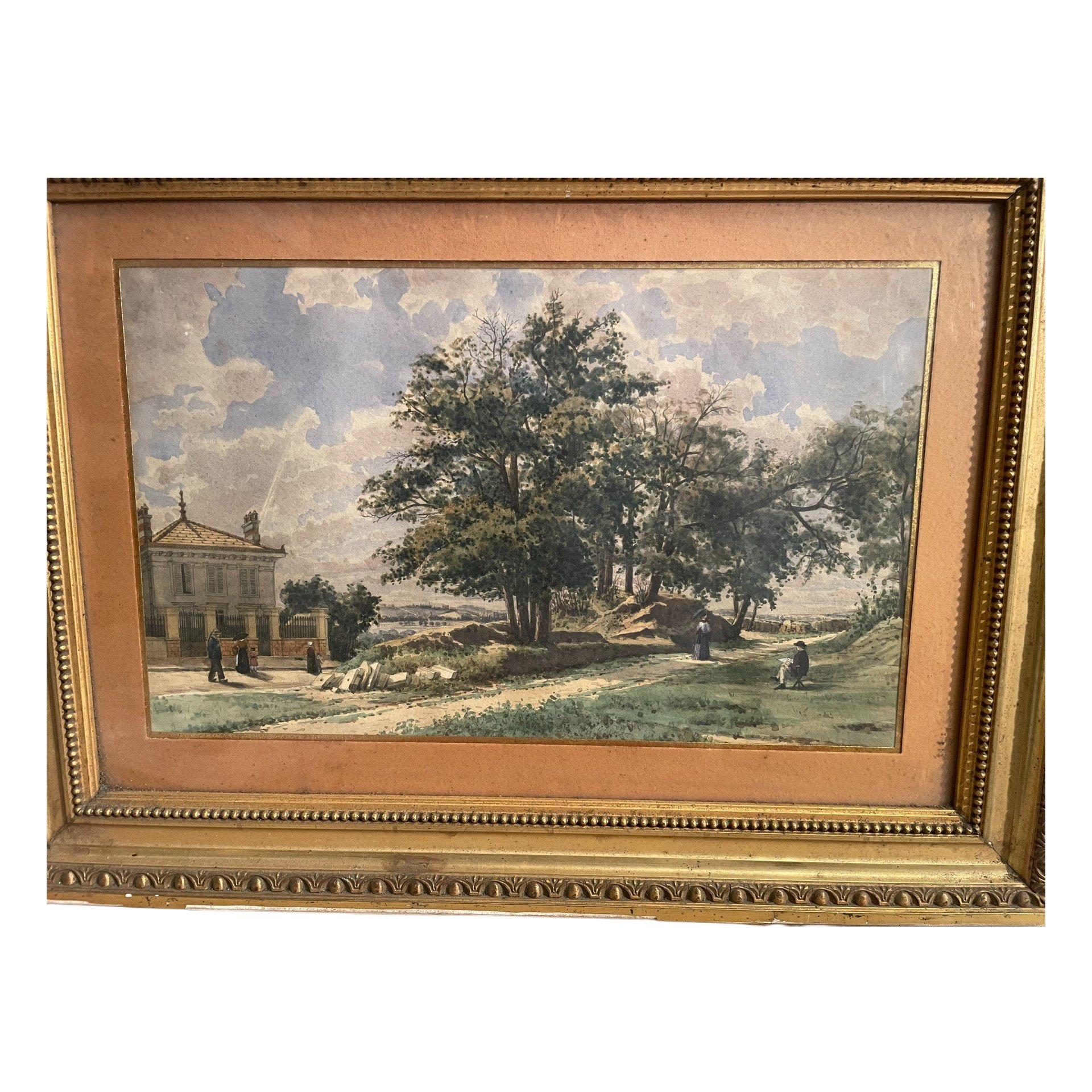 Aquarell unter Glas. Es zeigt Figuren vor einem schönen Haus und rechts eine Figur, die wie ein malender Künstler aussieht! Oder eine Frau mit Regenschirm zeichnet.