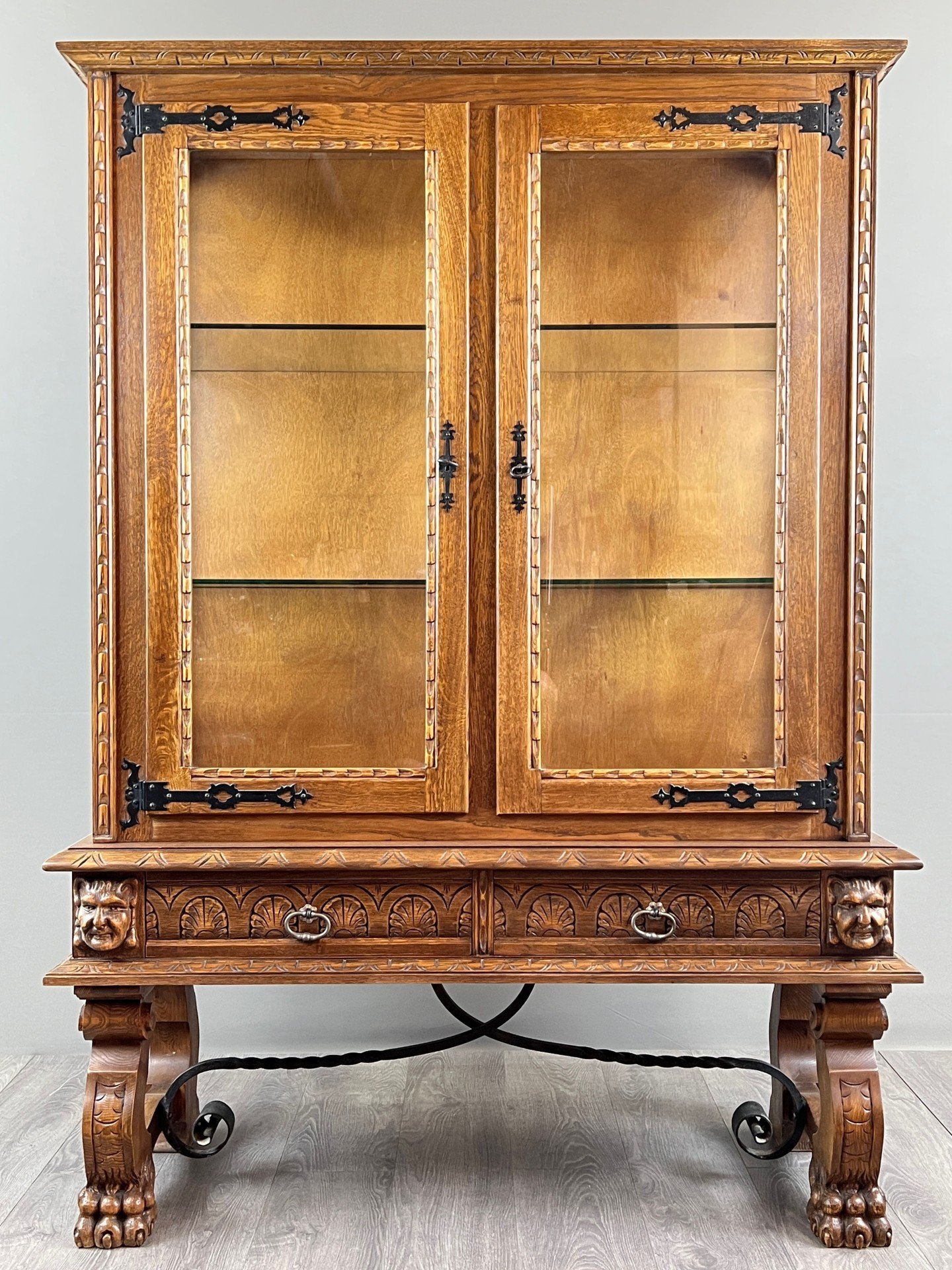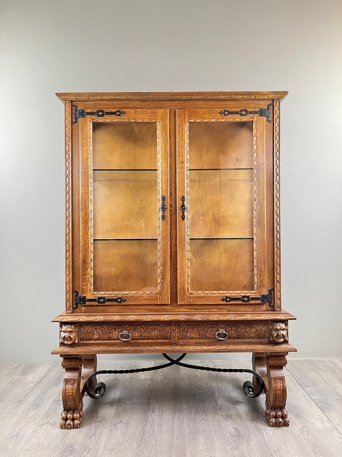 Imposante vitrine en chêne massif finement sculpté, reposant sur des pieds à enroulements terminés par des griffes et ornés de têtes de lion.