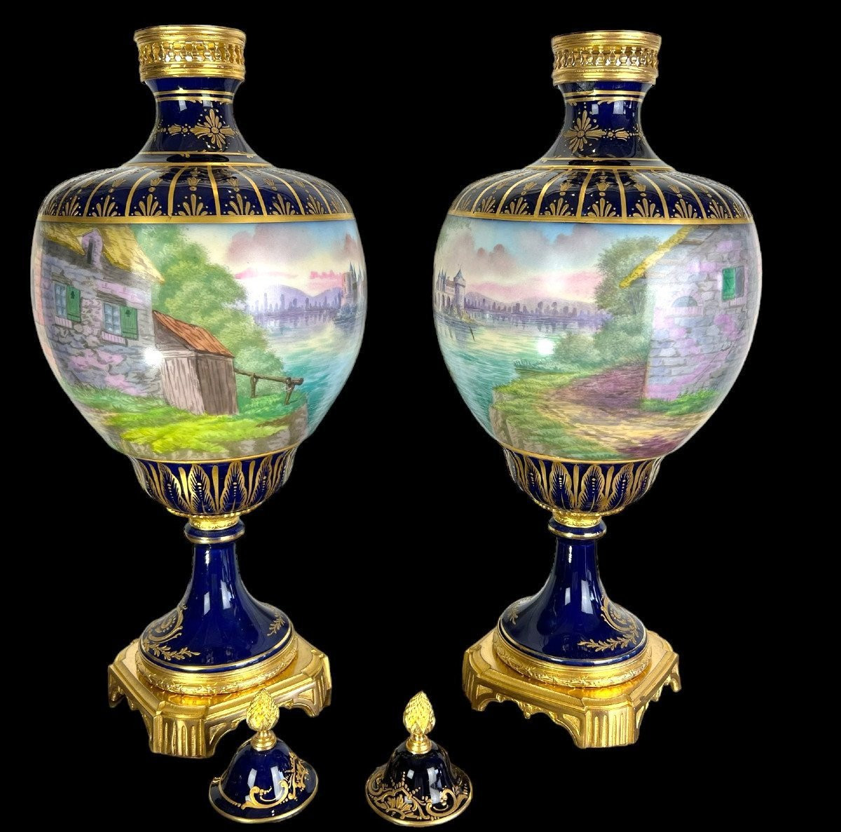 Ein Paar gedeckter Vasen aus Porzellan mit kobaltblauem Hintergrund und reicher Vergoldung.