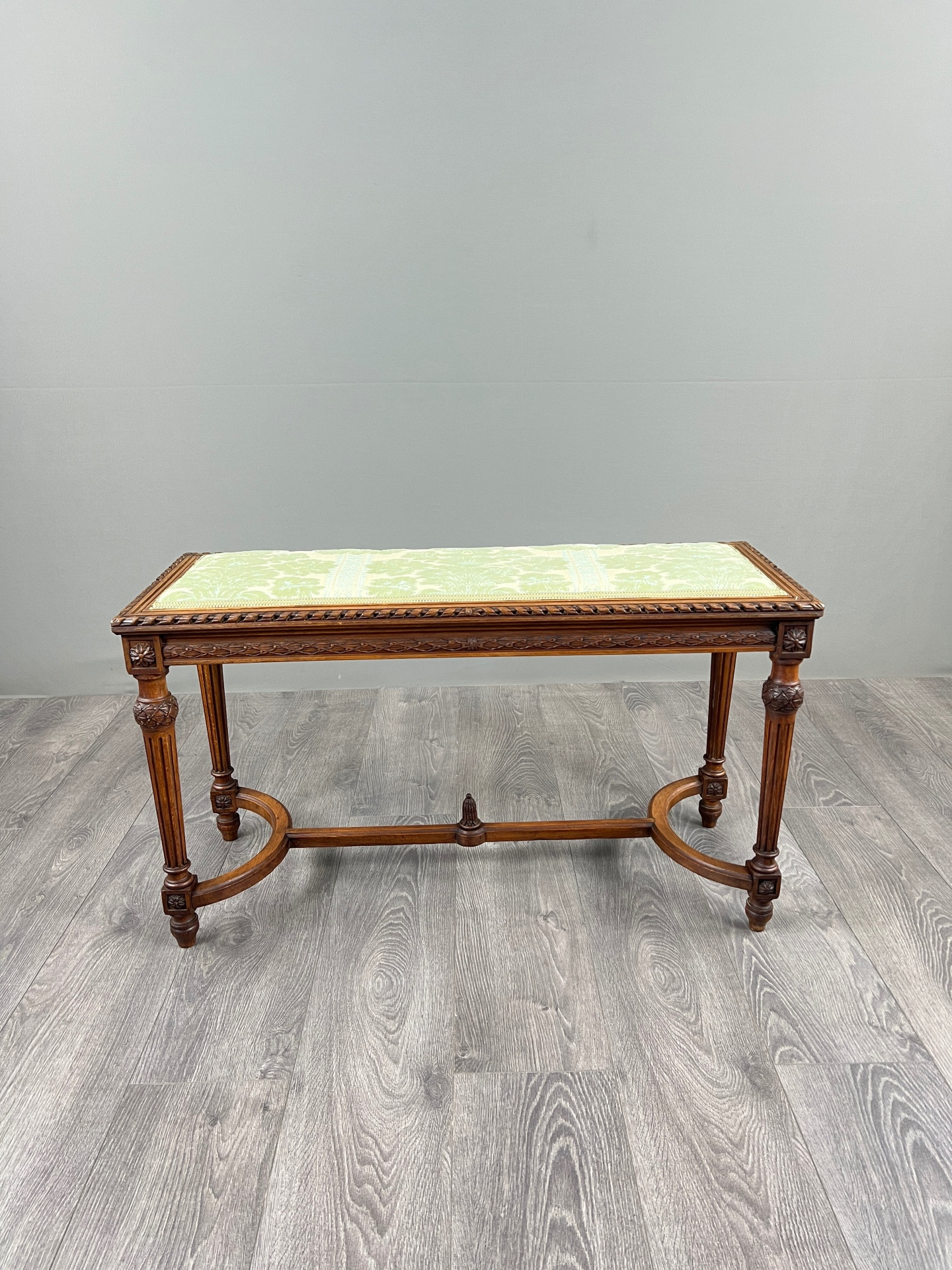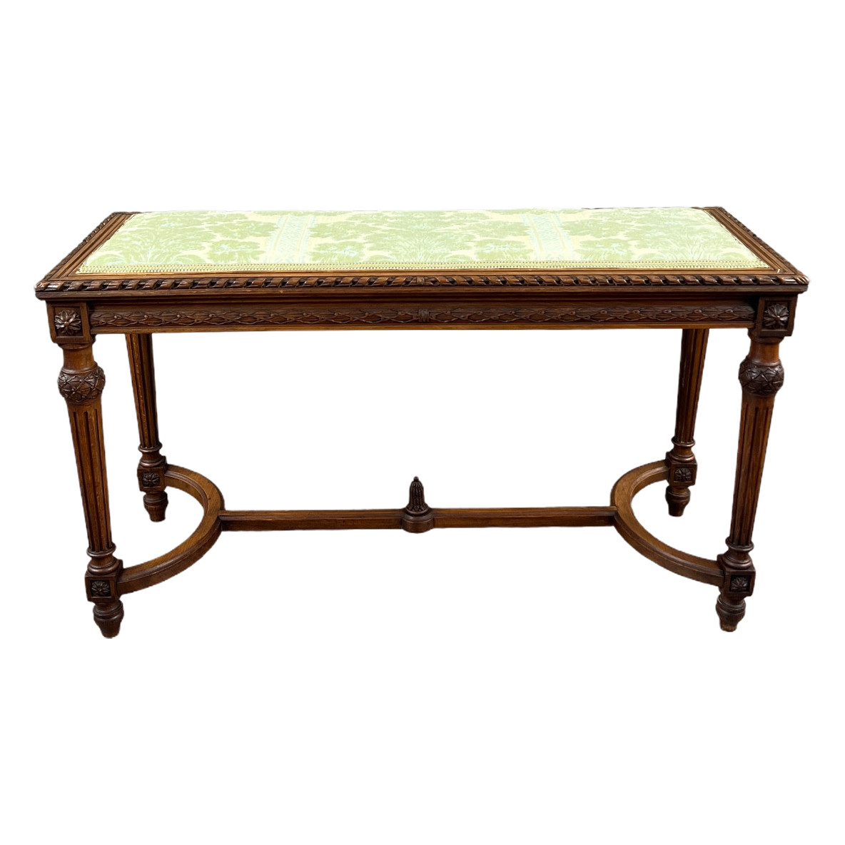 Élégante banquette de style Louis XVI en bois sculpté, reposant sur des pieds fuselés et cannelés, réunis par une entretoise en H à décor raffiné.