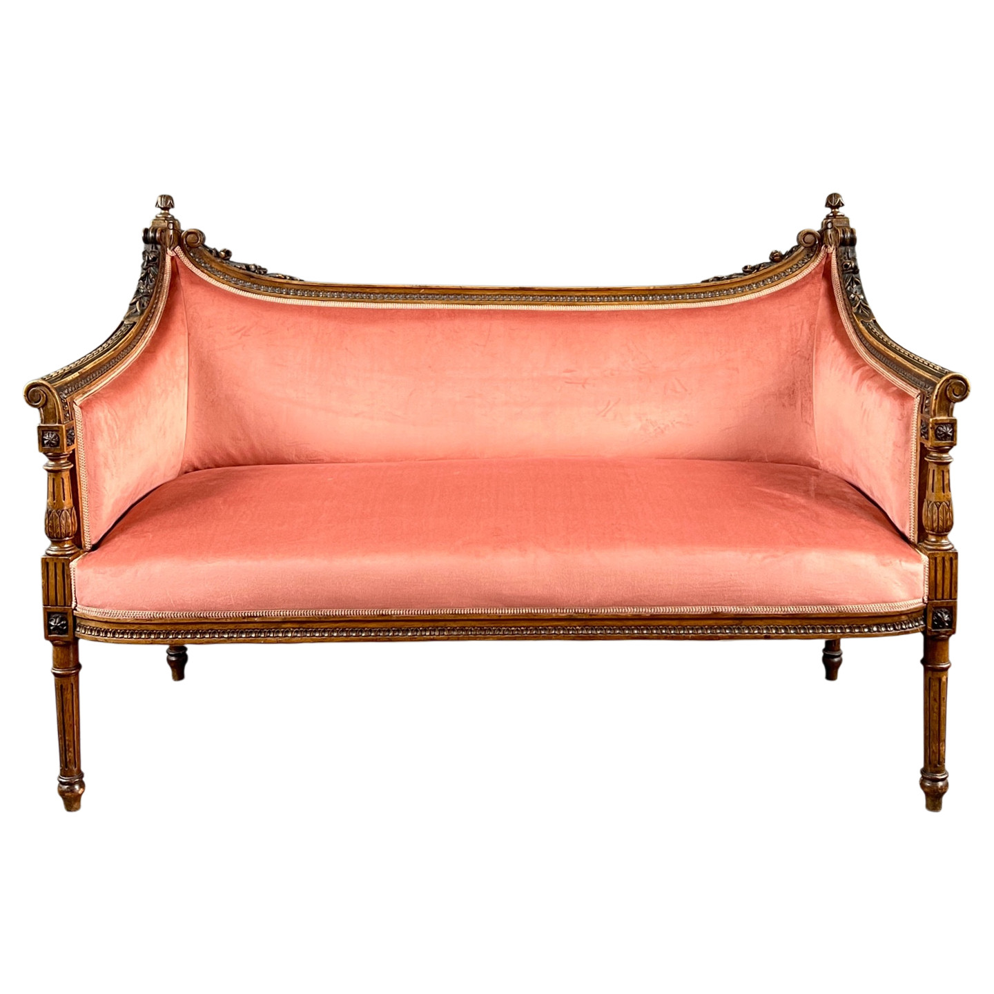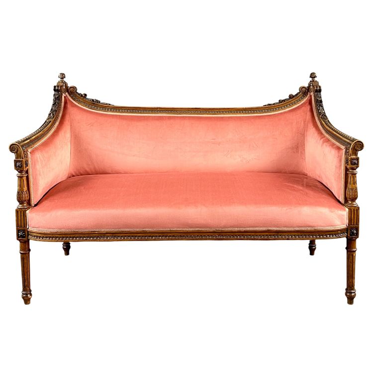 Élégant canapé de style Louis XVI en bois sculpté et mouluré reposant sur des pieds fuselés cannelés. Le dossier légèrement incurvé et les accotoirs à consoles présentent une belle décoration sculptée de style néoclassique.