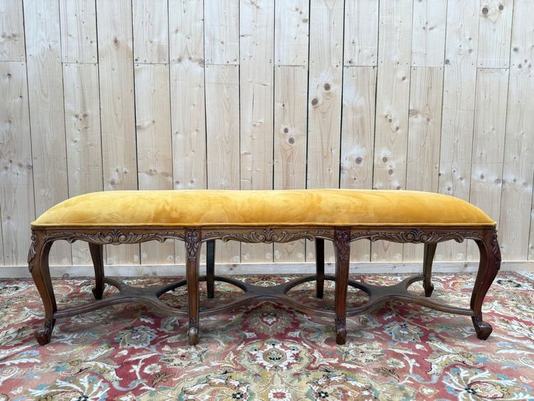 Große sechsbeinige Mittelbank aus braun gebeiztem Massivholz, verbunden durch X-förmige Abstandshalter, die für das Repertoire von Régence-Louis XV charakteristisch sind.