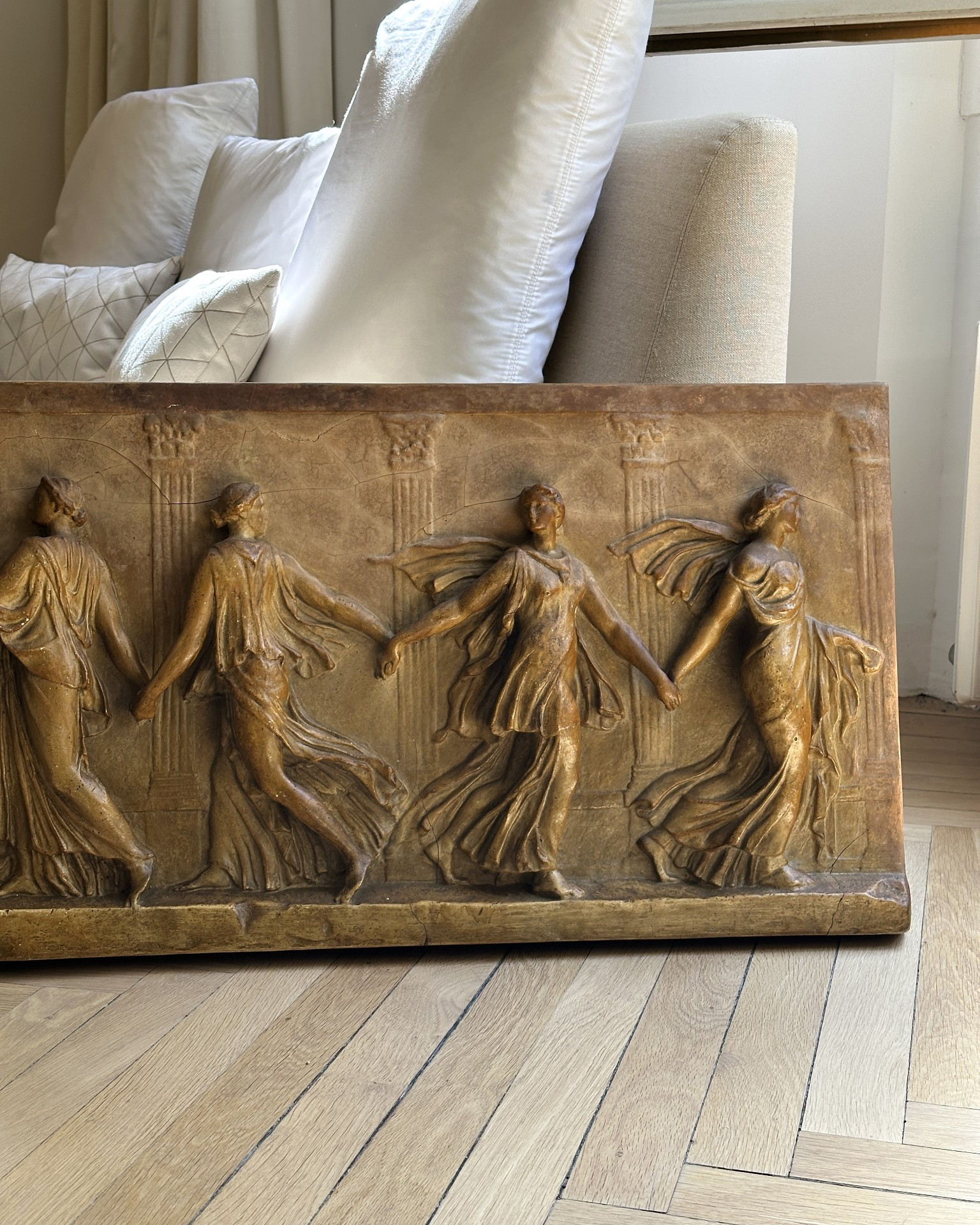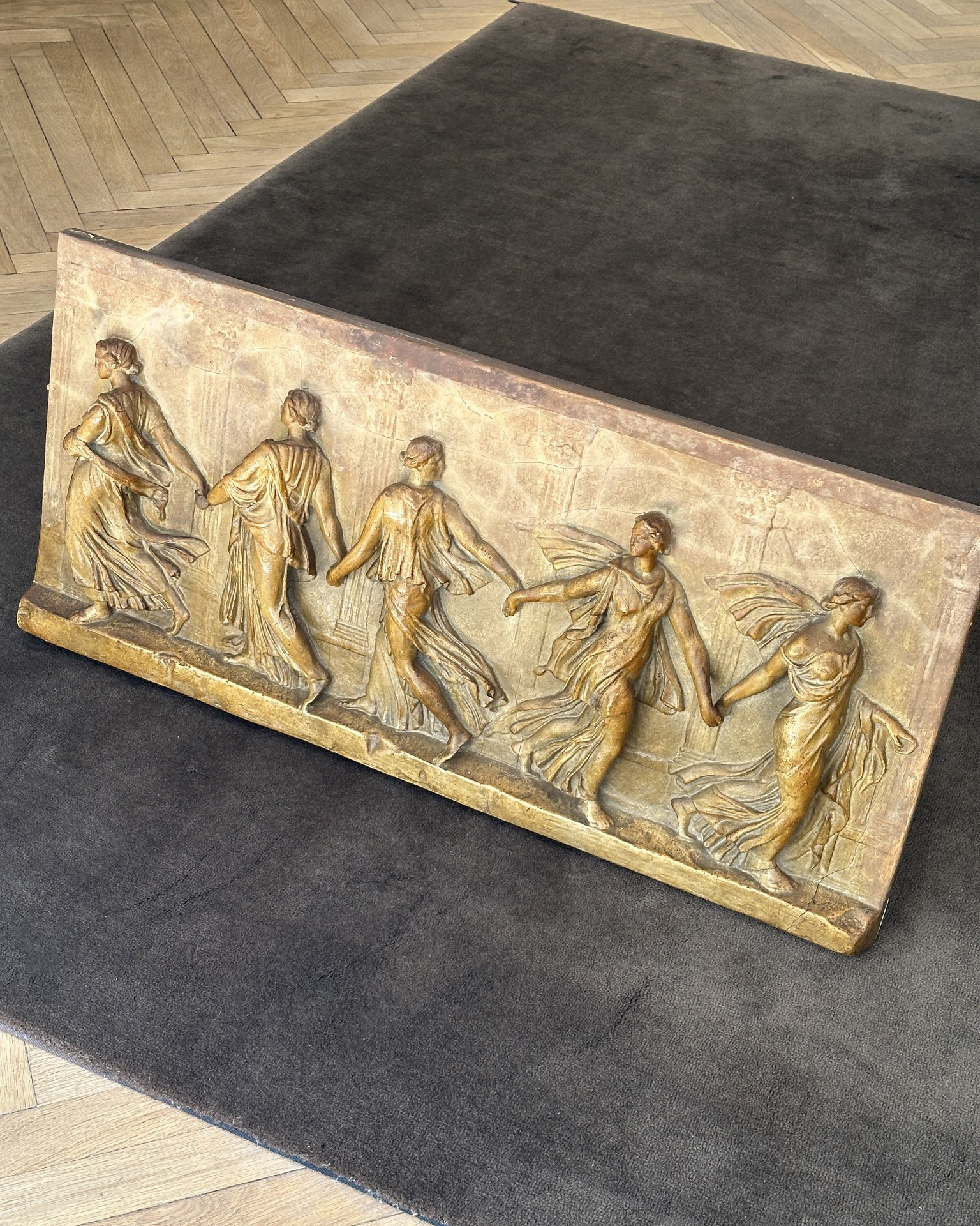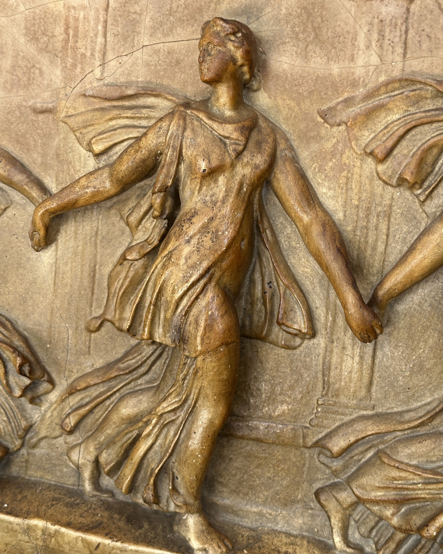 Dieser Gipsabguss, der fünf Grazien als antik drapierte Tänzerinnen darstellt, ist eine Nachbildung des berühmten antiken Basreliefs der Borghese-Tänzerinnen, das heute im Louvre aufbewahrt wird.