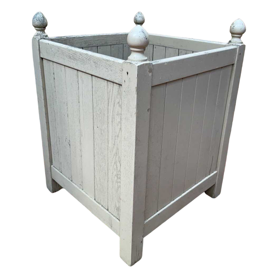 The structure rests on four square uprights topped with acorn-shaped finials, characteristic of traditional Versailles orange tree boxes. The four sides are clad in panels with joined vertical slats, framed by horizontal crossbars. The bottom is slatted to ensure drainage. The paint, beige in color with off-gray highlights, shows significant chipping and wear revealing the wood in several places. This patinated appearance is consistent with the age of the piece. Repainting or cleaning to be carried out depending on the desired use. Dimensions: H. 95 cm – L. 70 cm – Estimated weight: 80 kg.