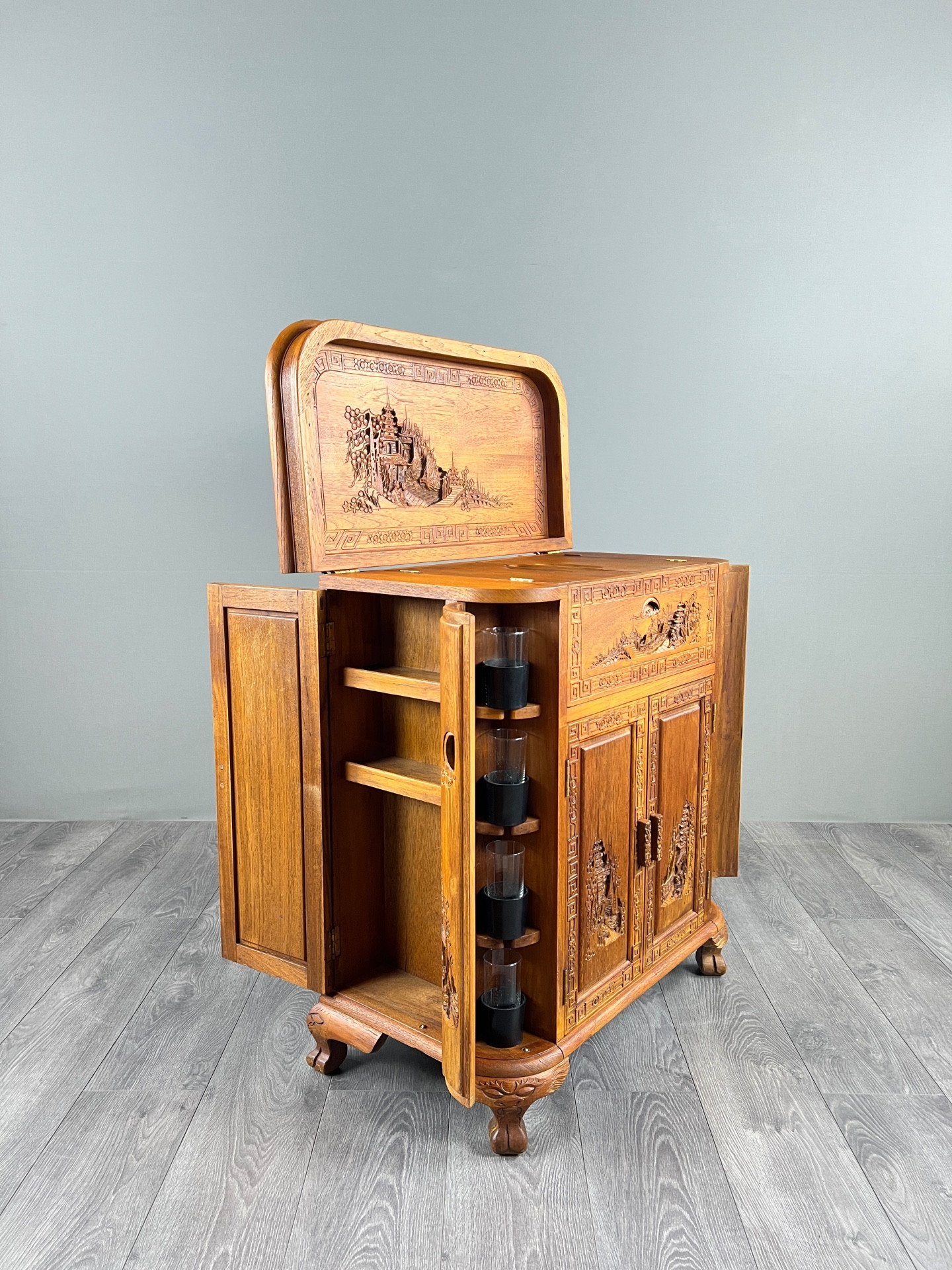 Charming bar cabinet in finely carved wood, inspired by Asian aesthetics, richly decorated with landscape scenes, pagodas and figures in relief.