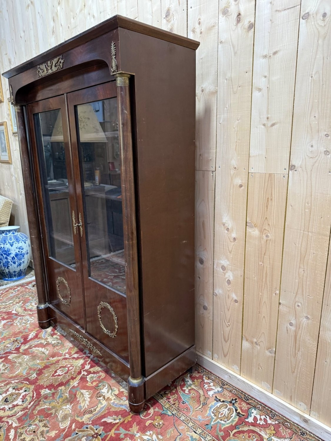 The upper part is made up of two glass doors giving access to four interior shelves; the lower part has flamed mahogany panels. The gilded bronze ornamentation is characteristic of the Empire repertoire: central pediment with facing winged griffins, corner palmettes, engaged columns with bronze rings and capitals, laurel wreaths and floral sprays on the lower leaves, frieze with foliage on the plinth. The chiseled bronze keyholes in the shape of a palm tree constitute a carefully crafted detail. The interior bottom is made of secondary boards, in accordance with workshop practices of the time. The general condition shows patinated wear consistent with the age of the piece: scratches on the varnish, chips and visible traces of use; cleaning and refinishing of the varnish are to be expected. Operation of the locks not specified. Depth of shelves: 30 cm. Dimensions: H. 185 cm – L. 120 cm. Weight: 60 kg.