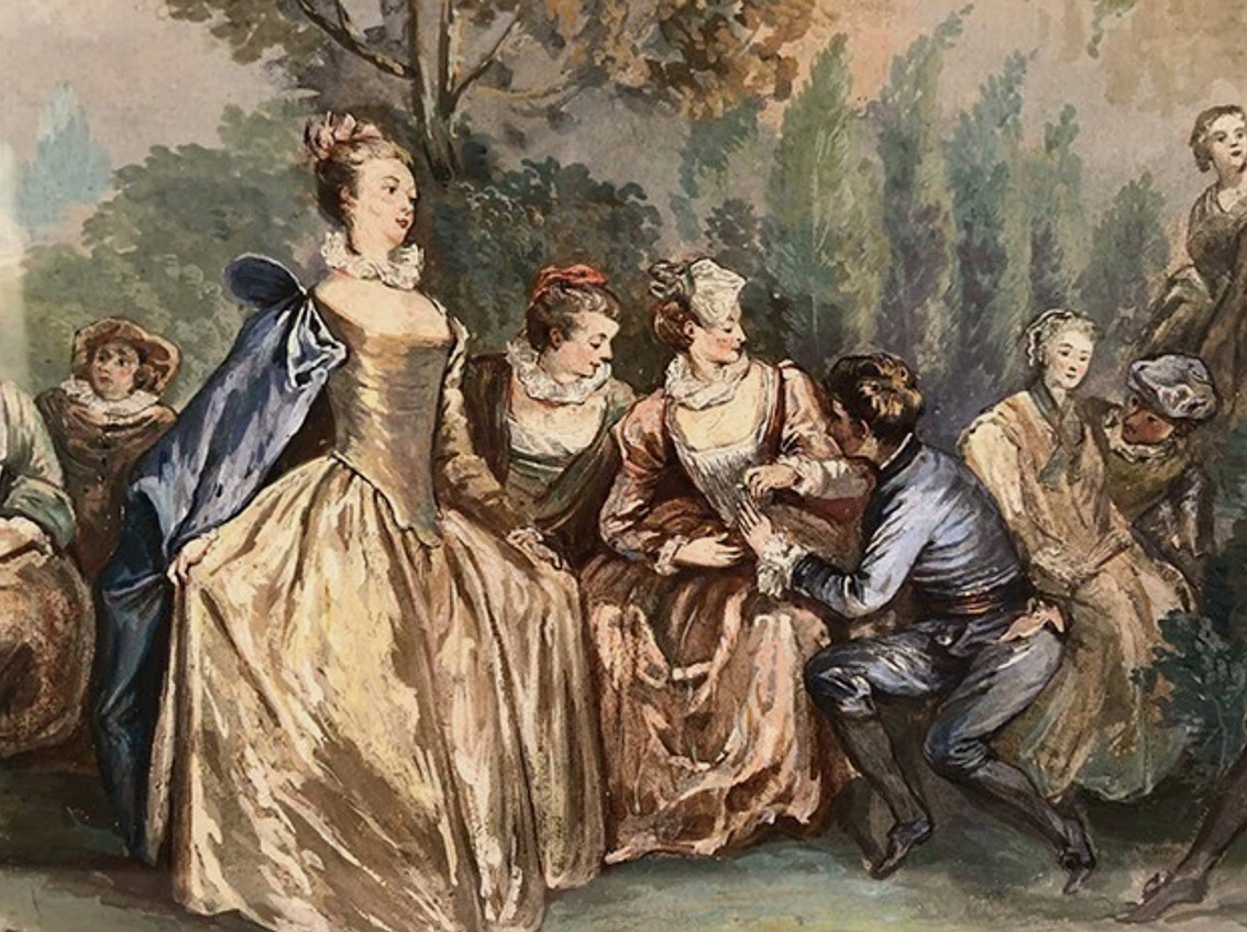 Garden Party, framed watercolor, late 19th century