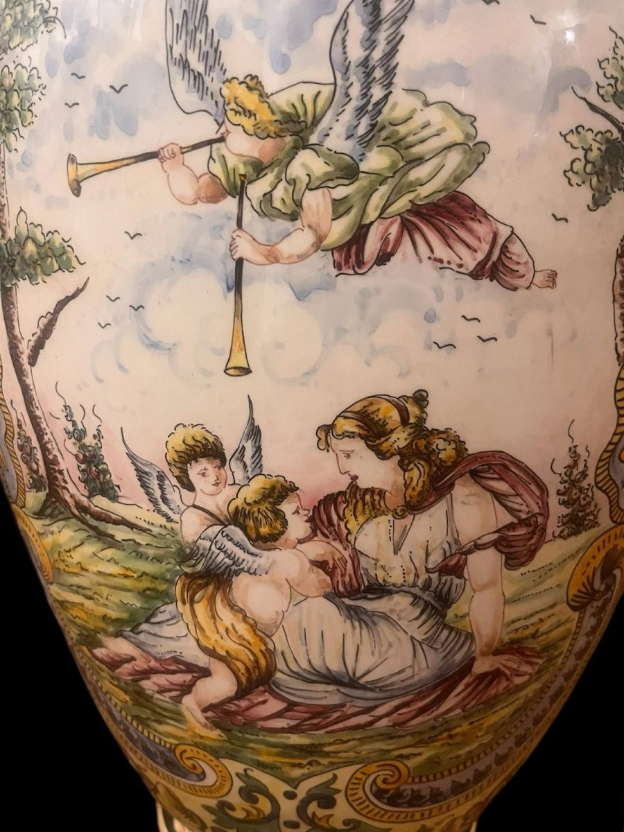 Important covered vase in polychrome glazed earthenware, of fine decorative quality, in the Italian Renaissance style, French manufacture from the late 19th century (signed under the base).