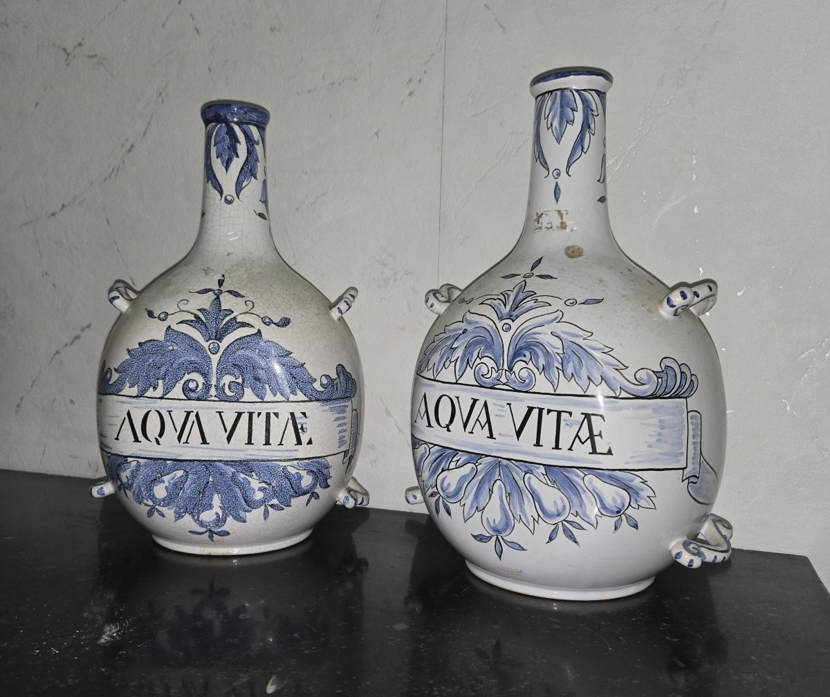 An elegant pair of earthenware apothecary flasks with a blue decoration on a white background, bearing the inscription “Aqua Vitae” (brandy), typical of antique apothecary containers.