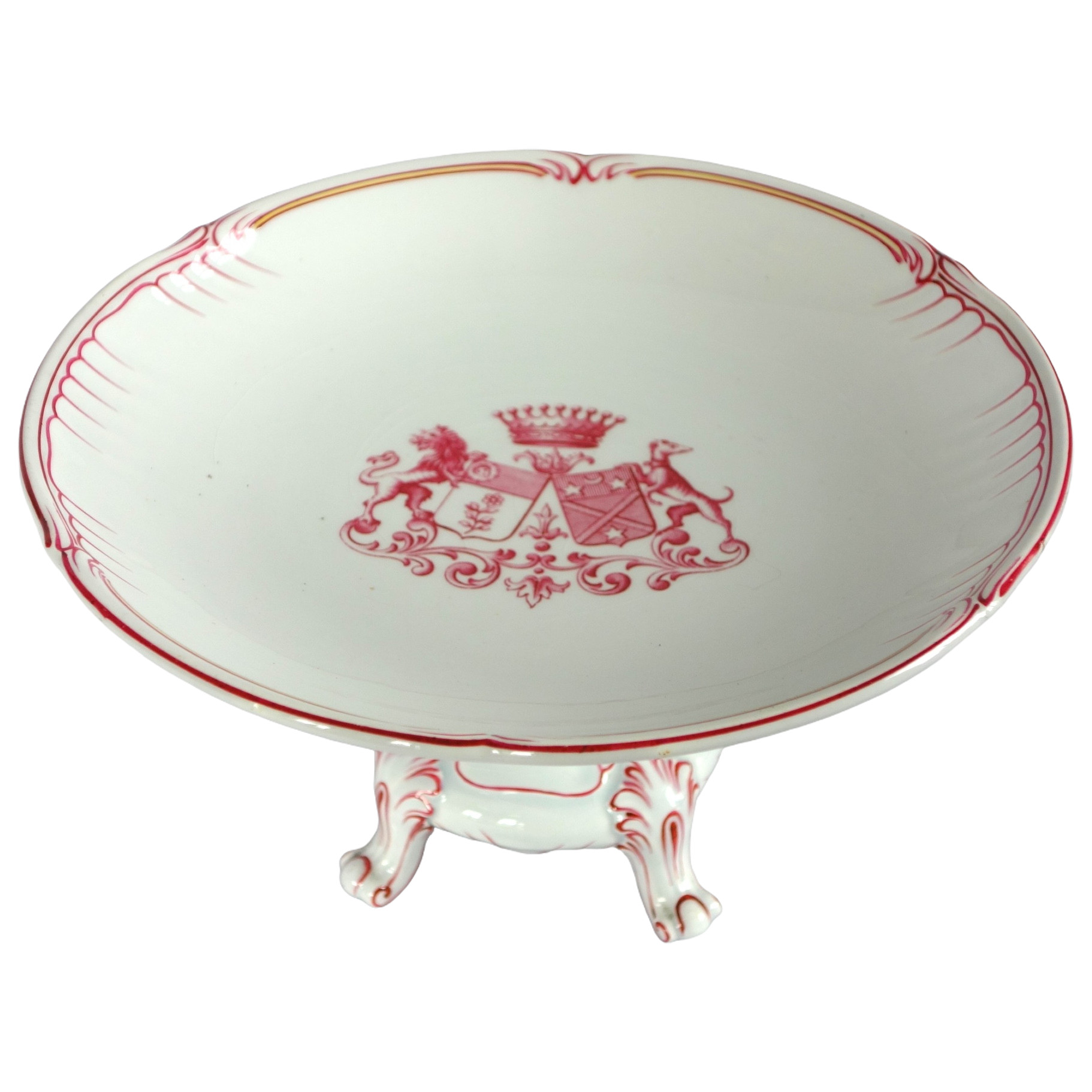 Assiette à gâteaux ou à fruits de style Louis XV montées sur 4 pieds rocailles. Elle porte des armoiries d’alliance sous couronne Comtale. En dessous le tampon Lunéville China. Fin XIXe siècle, vers 1880-1900.