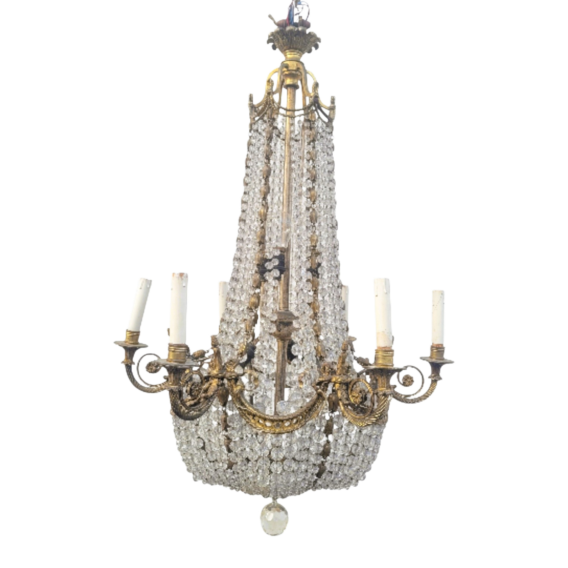 Chandelier sold as is: gilding worn, no missing tassels; electricity required (6 lights outside and 6 inside)