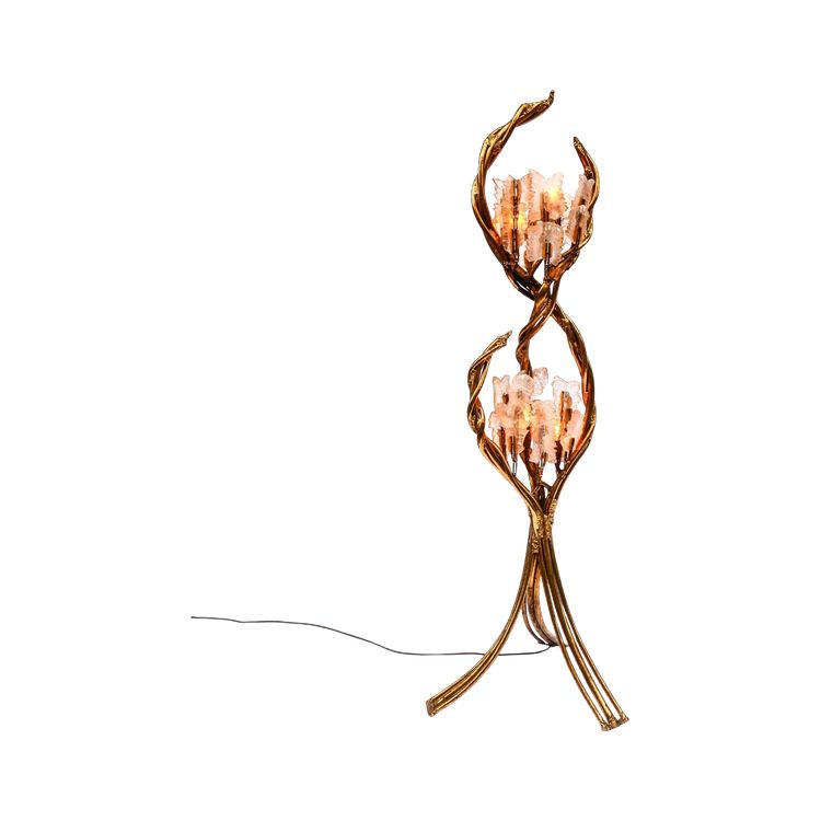 Striking two-light sculptural floor lamp signed Henri Fernandez, a French designer active in the 1970s and renowned for his intricate work in gilded bronze and brass with organic, opulent forms. The structure, crafted in gilt brass, evokes intertwined branches or vines, supporting two luminous clusters adorned with natural rock crystal elements. These crystalline forms diffuse a warm, precious light and create a bold, dramatic visual impact. A rare and collectible piece, perfectly representative of 1970s French brutalist and baroque-inspired design.