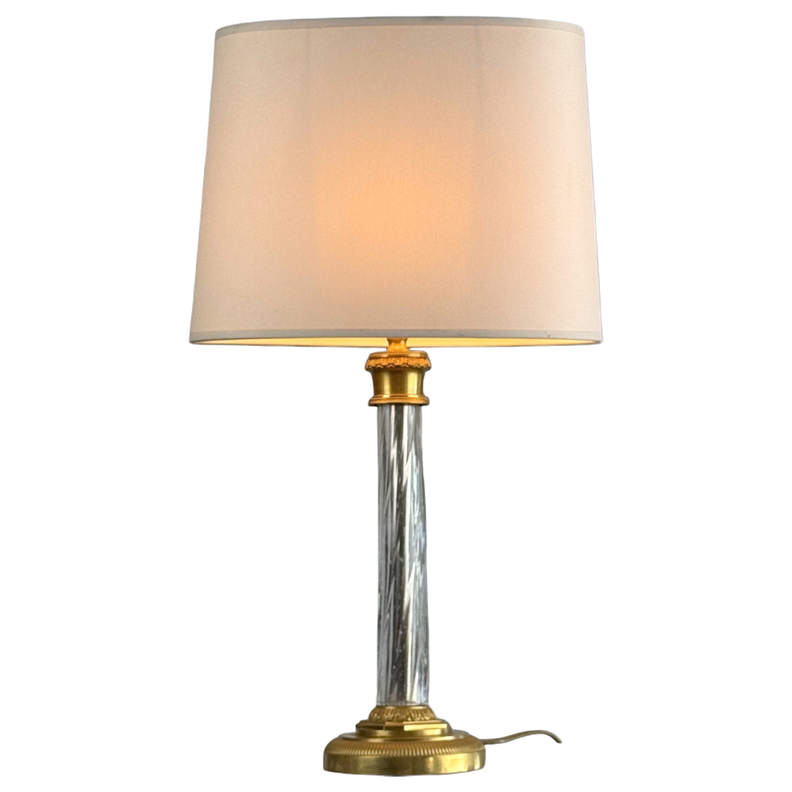 The delicately twisted central crystal stem subtly captures and diffuses the light, resting on a finely molded circular bronze base with classical decoration.
