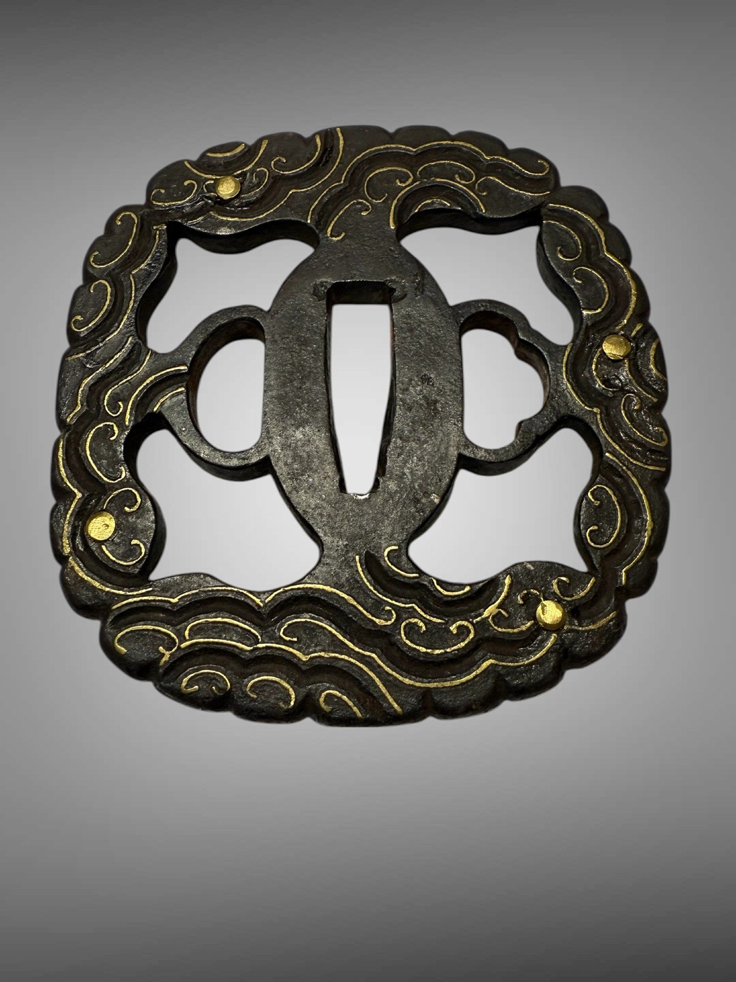 Decoration: Gilded brass inlays (nunome-zōgan) forming a network of stylized clouds and waves (kumo-nami-zu)