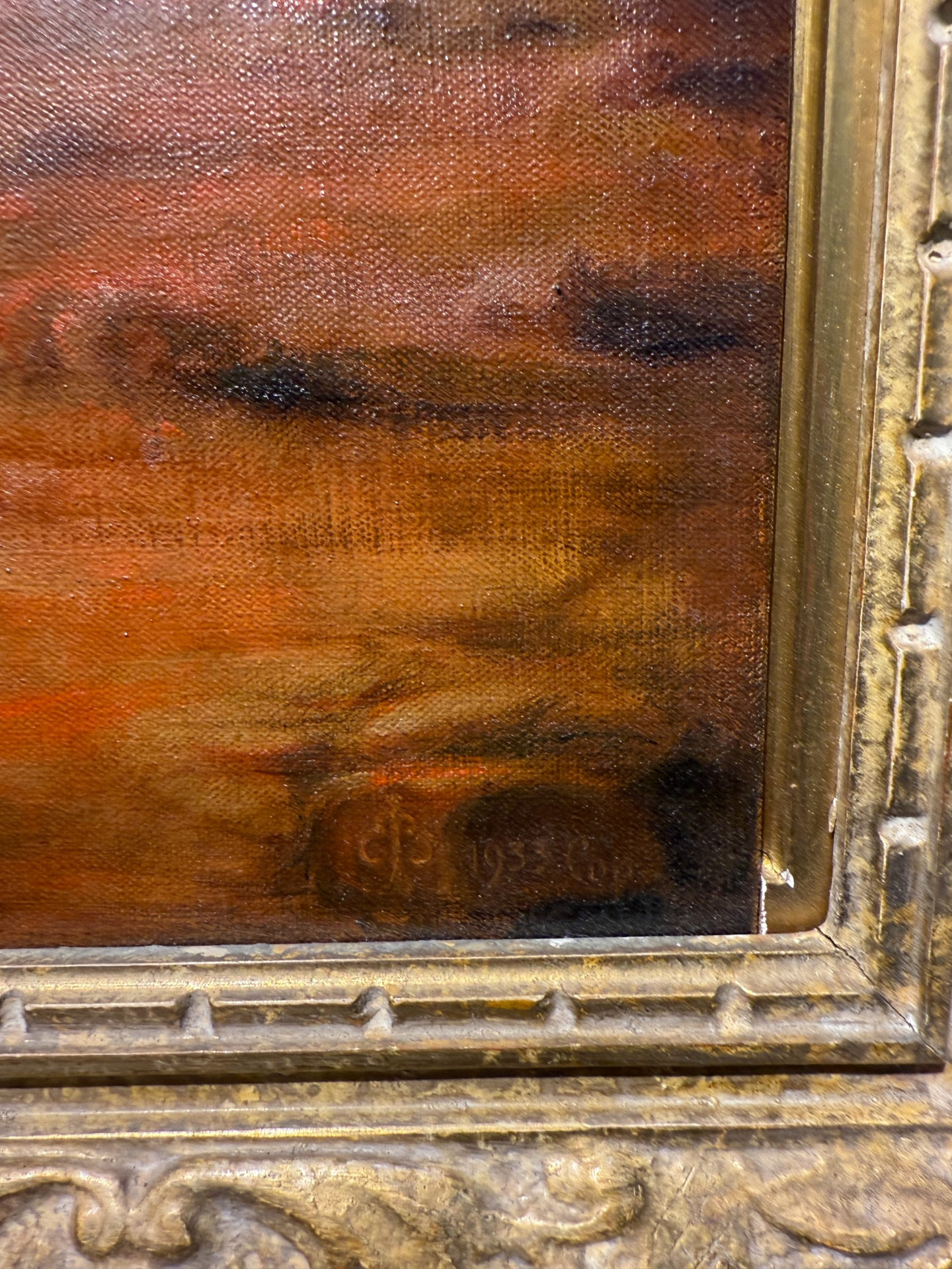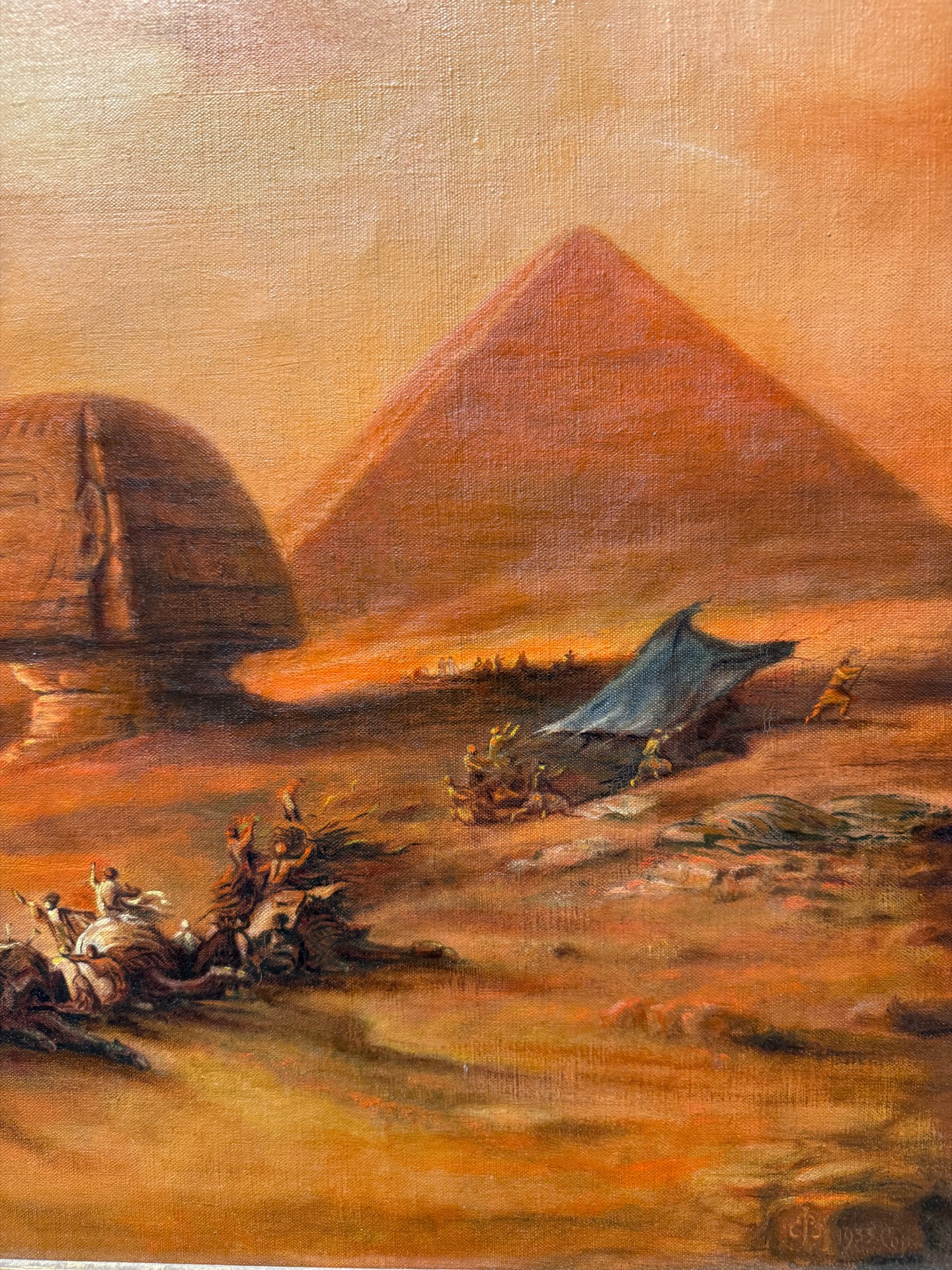 Oil painting on canvas Pyramids and characters orientalist landscape, 20th century, 90x69cm