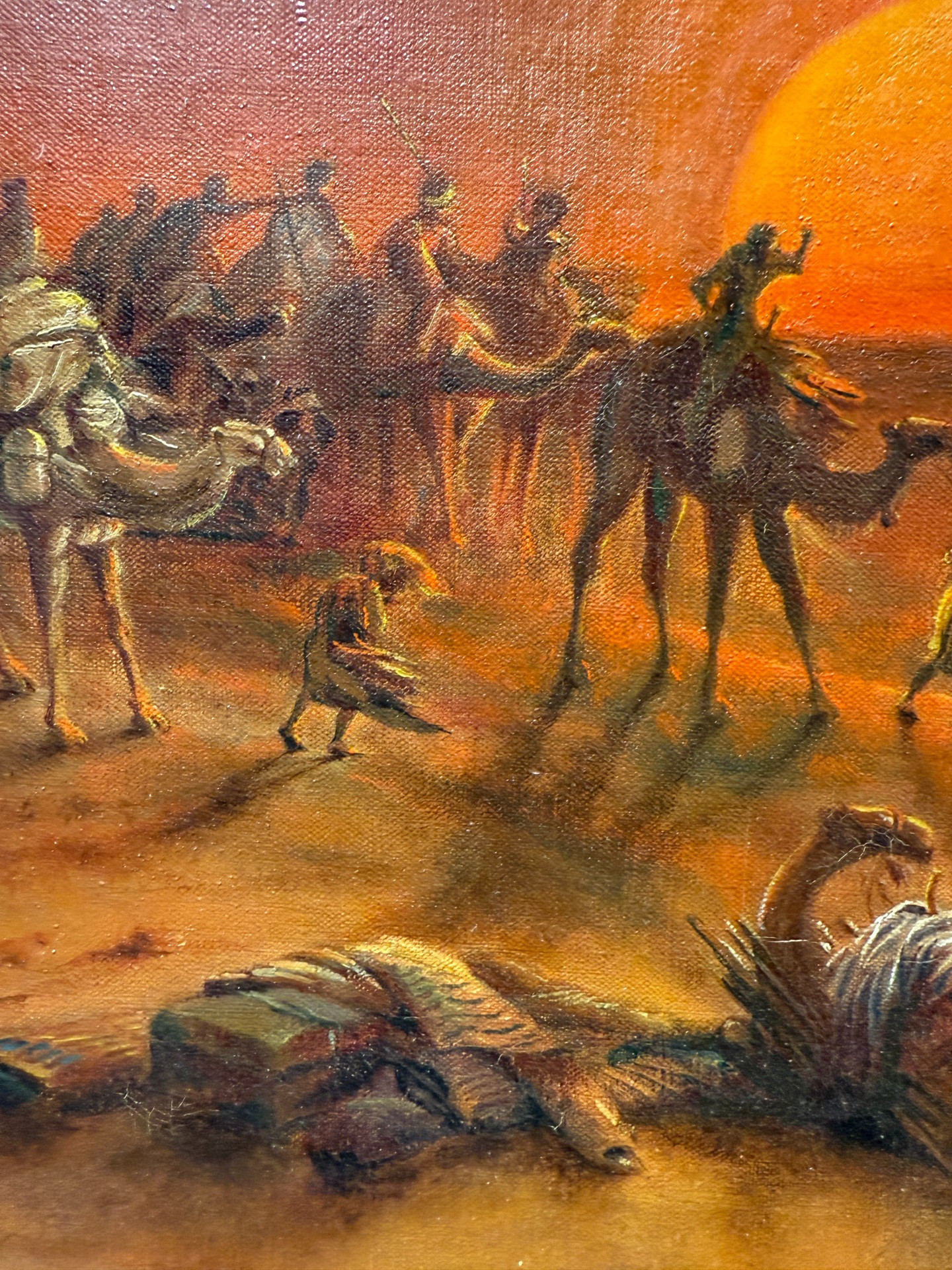 Oil painting on canvas Pyramids and characters orientalist landscape, with camels and Bedouins, 20th century, 90x69cm