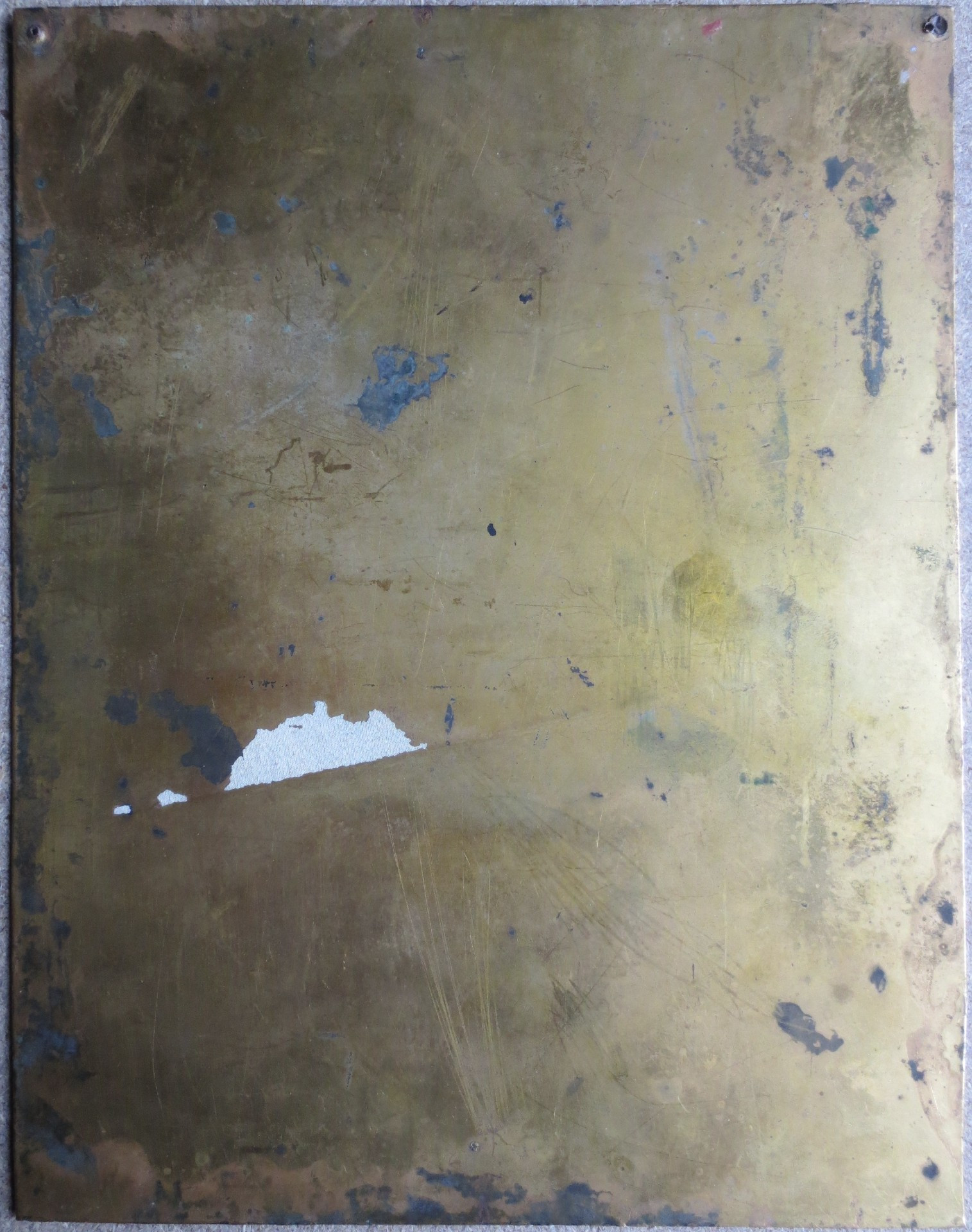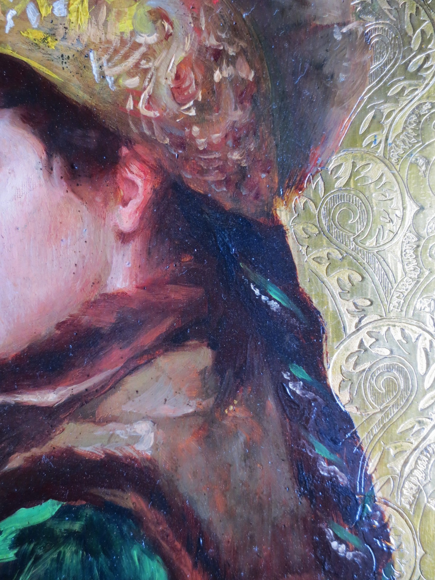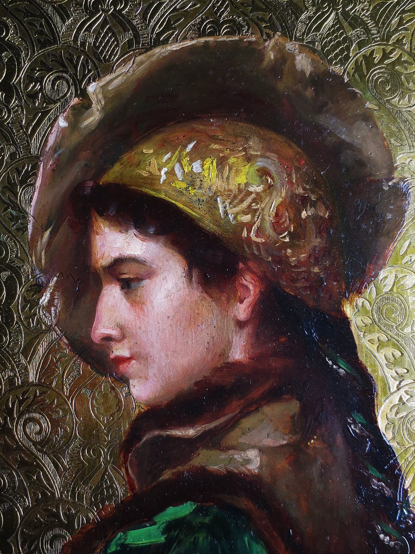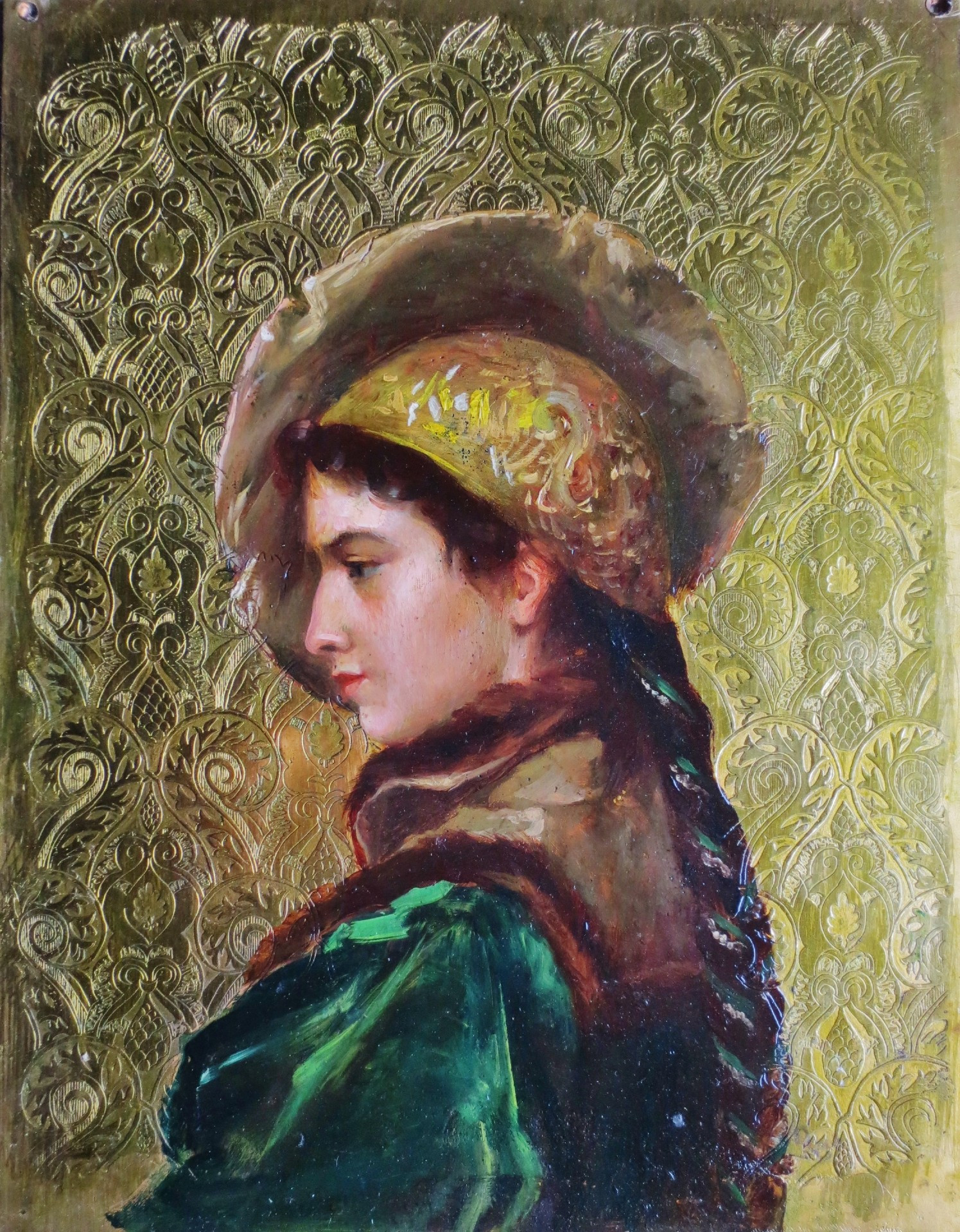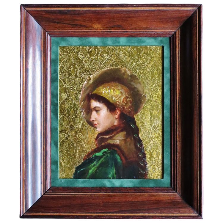 Cette ravissante jeune femme évoque la peinture russe. De la deuxième moitié du XIXe siècle, cette œuvre est peinte sur un support inhabituel, il s'agit d' un panneau de laiton dont la surface, cernant le portrait, est gravée de motifs de volutes et d'arabesques, ce fond en laiton doré évoque les rizas qui embellissent parfois les icônes. Ce procédé très original présente un intérêt esthétique incontestable , il met en valeur en le faisant ressortir ce profil de jeune élégante. Ce portrait de grande qualité nous a fait penser à certaines œuvres d' Ilya Repine peintre russe appartenant au mouvement dit des « ambulants »