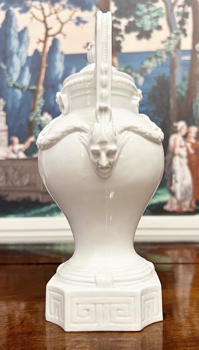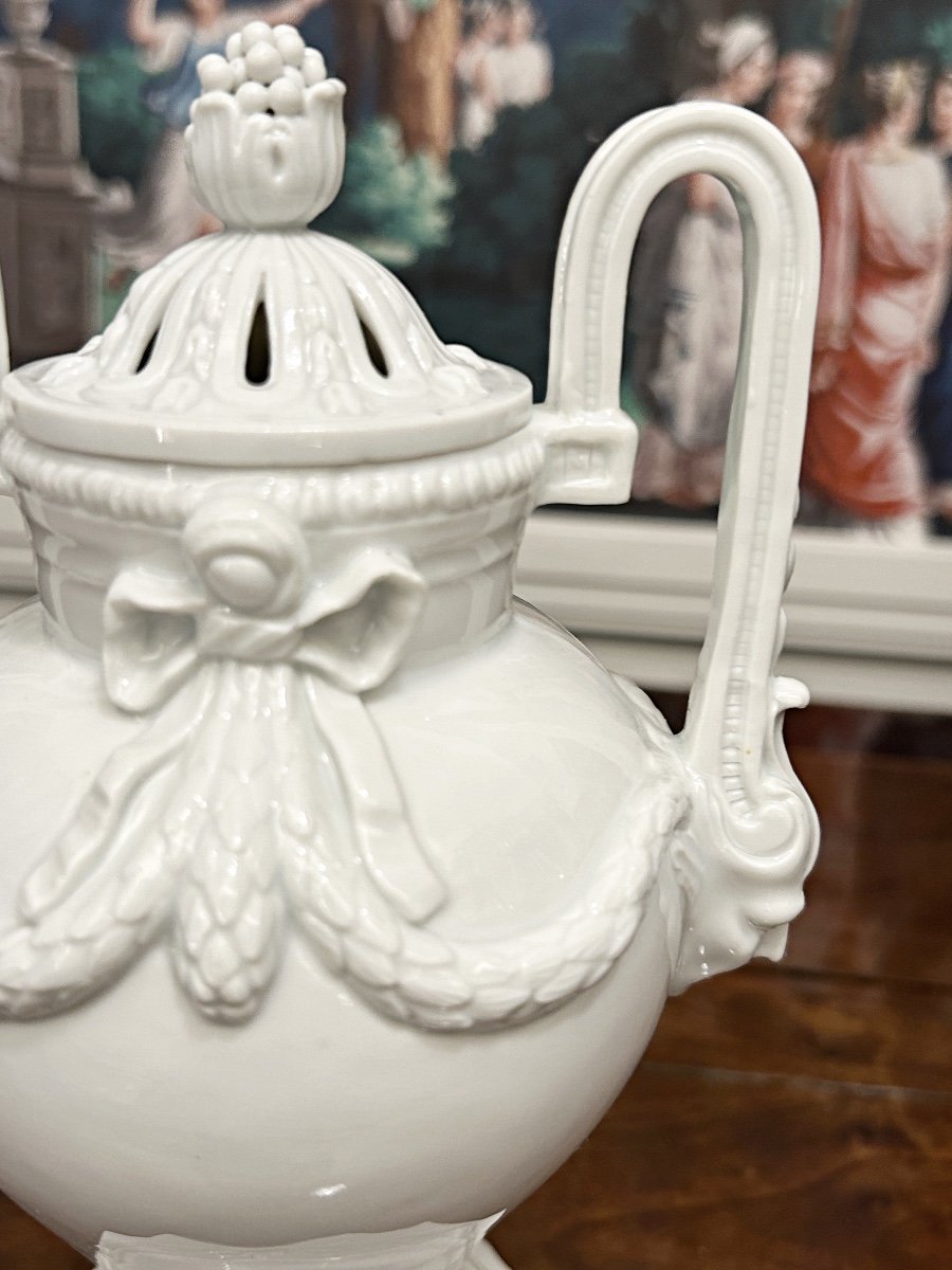 A neoclassical potpourri jar in white Meissen porcelain. Shaped like a covered urn, it features a base decorated with Greek key patterns, a body adorned with laurel wreaths tied to the neck with a ribbon bow, and an openwork lid surmounted by a naturalistic seed.