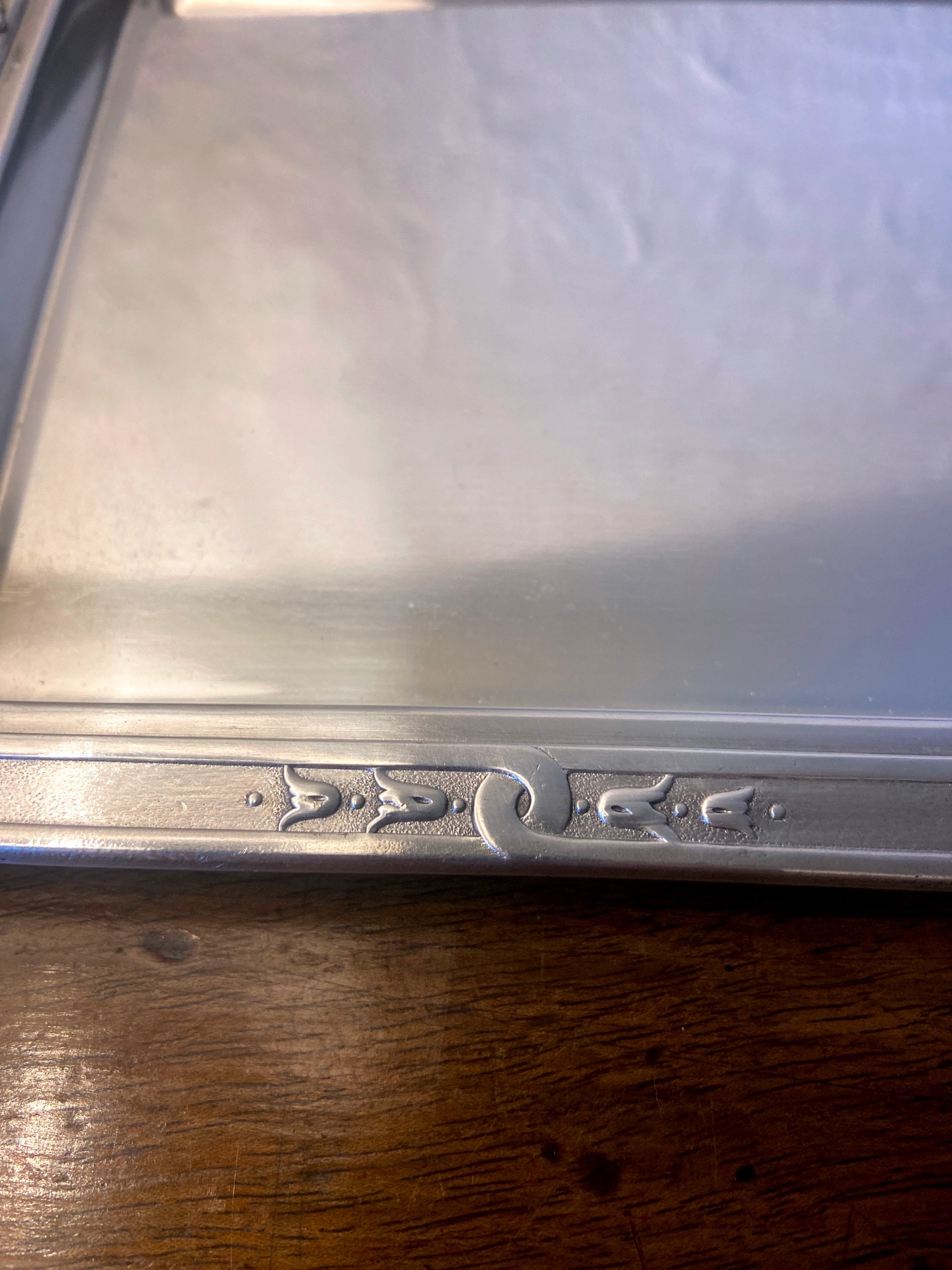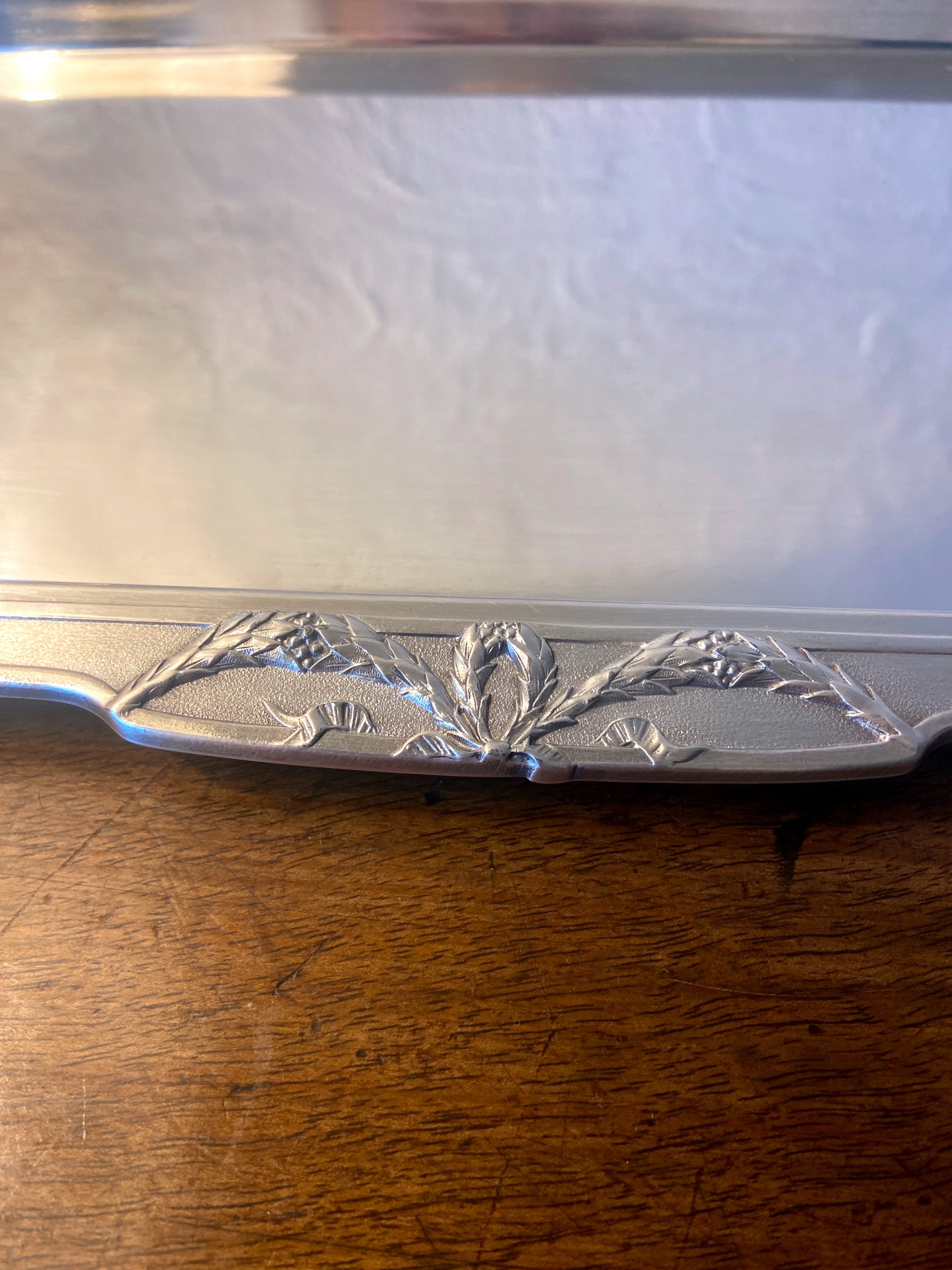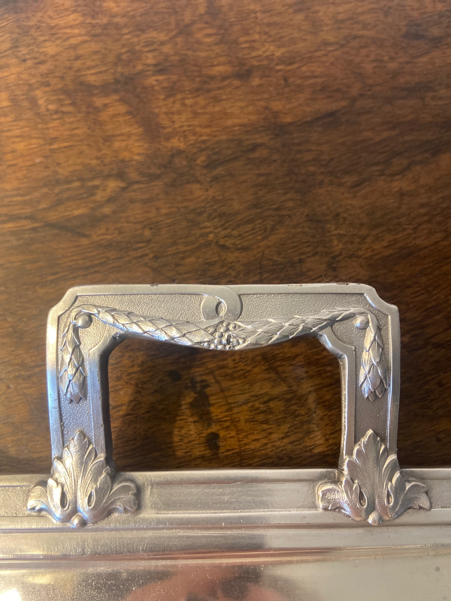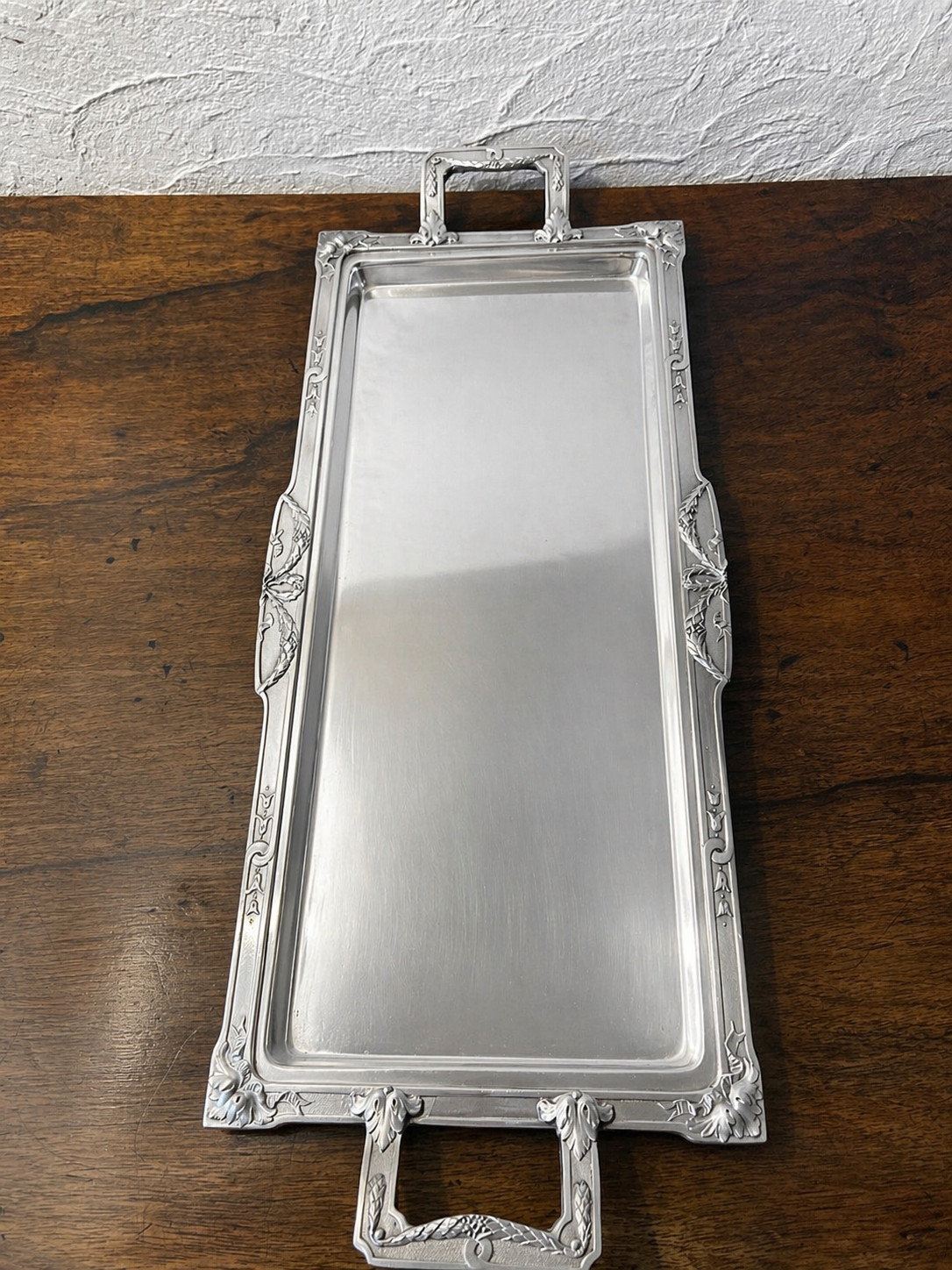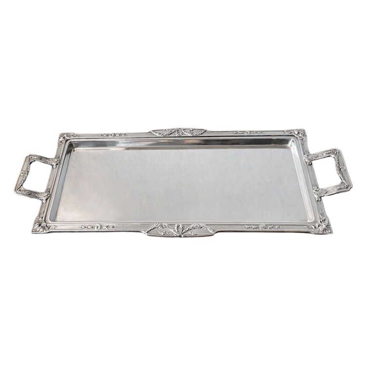 Vassoio rettangolare in metallo argentato dal design elegante e senza tempo con manici integrati.