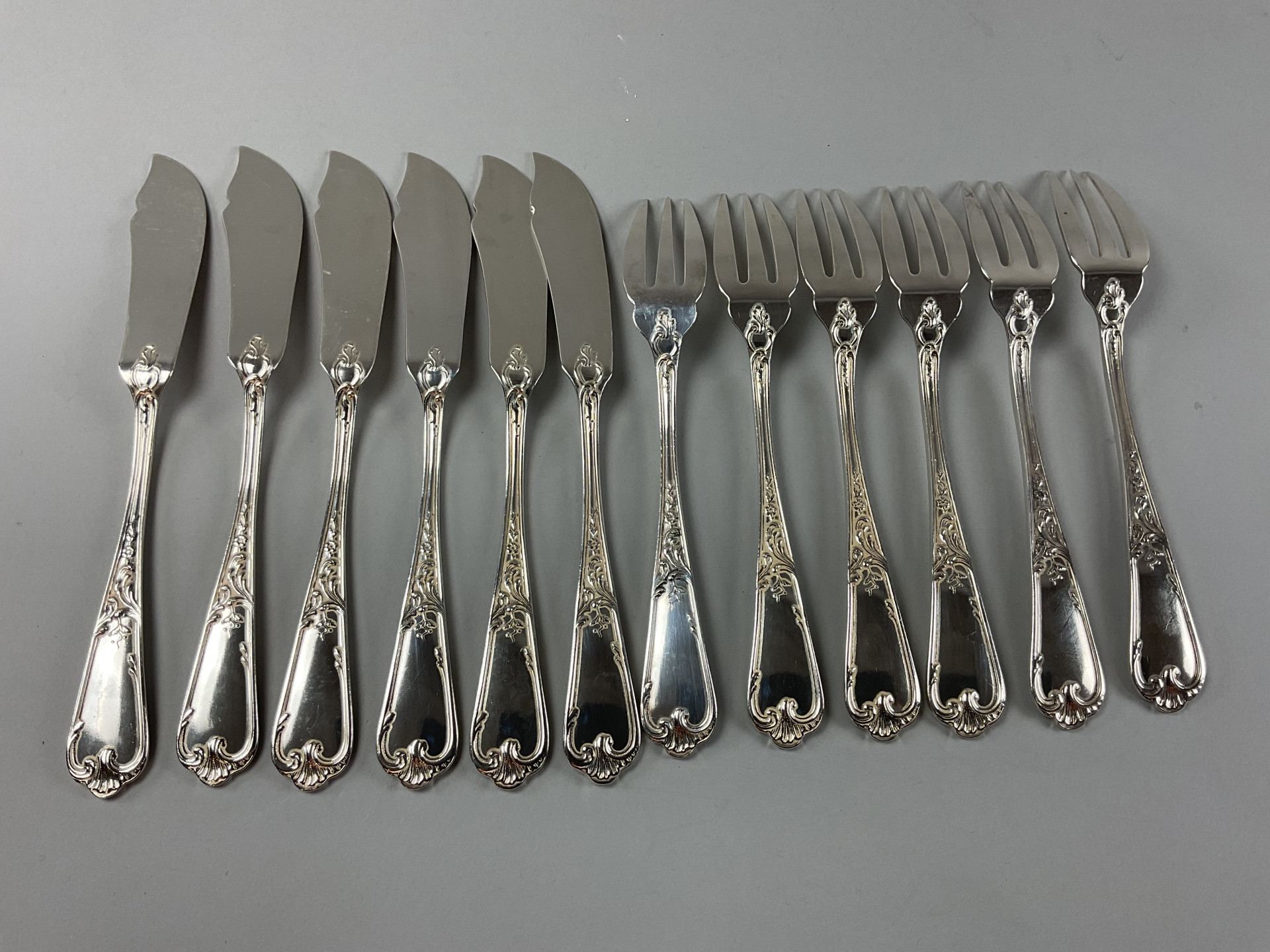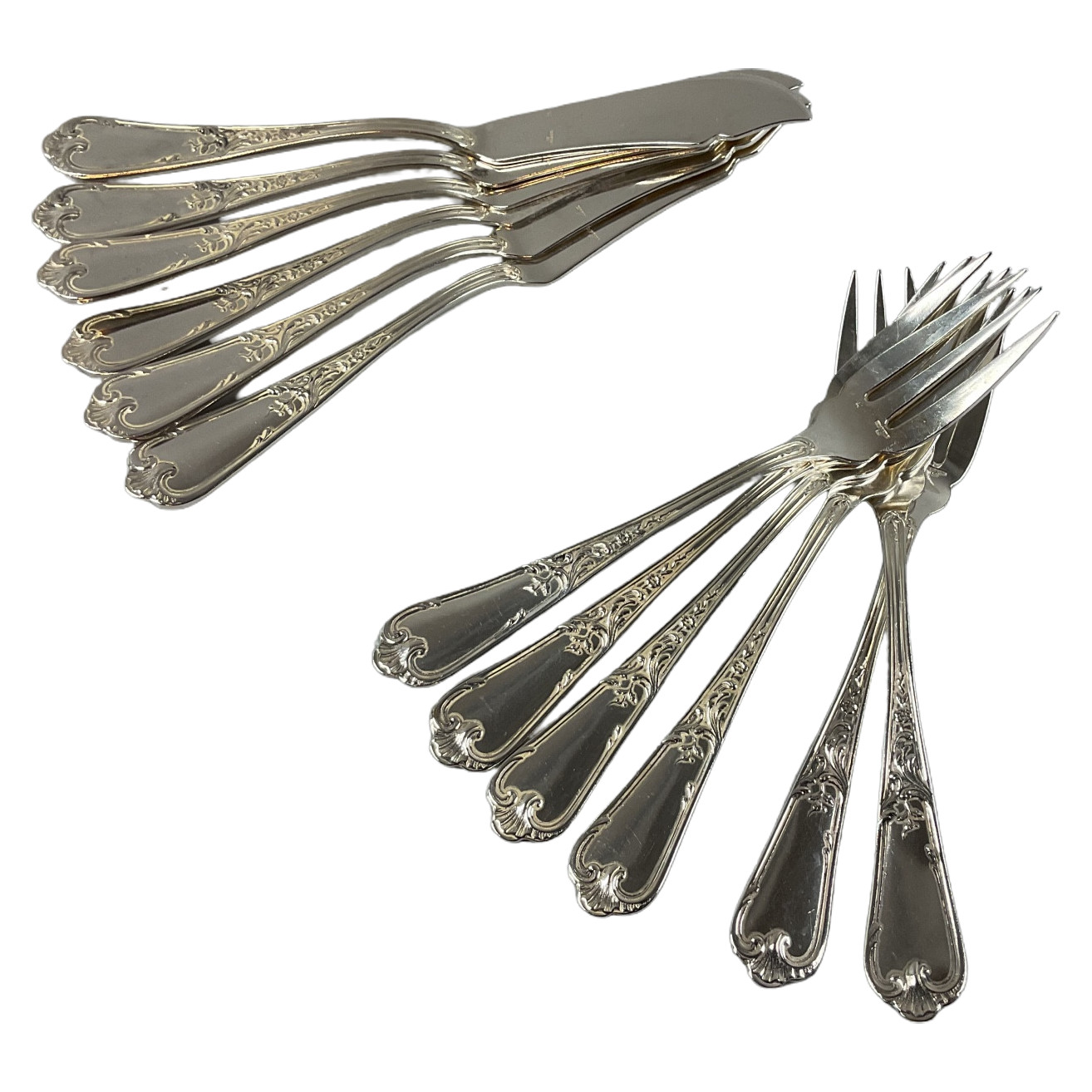 Six fourchettes et six couteaux en métal argenté modèle Dubarry signés Dubarry ancien