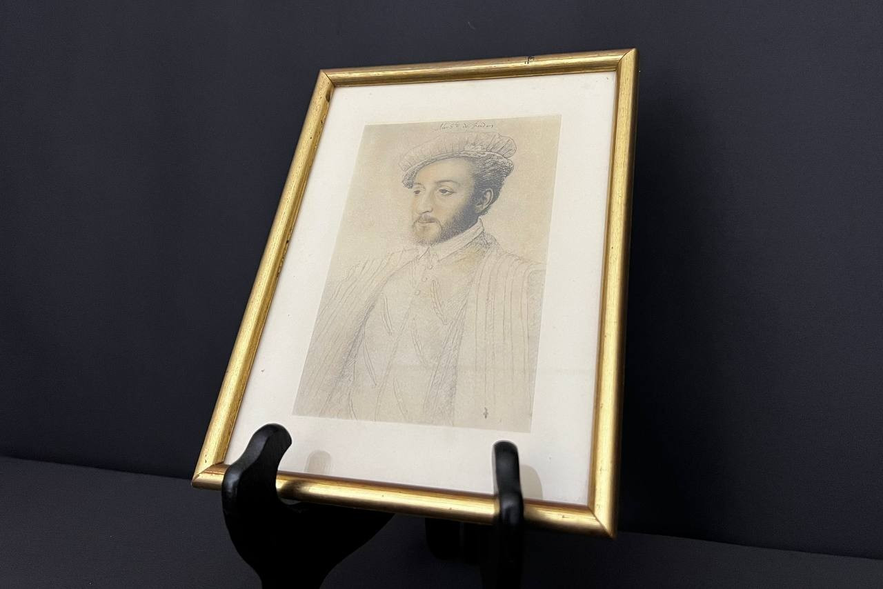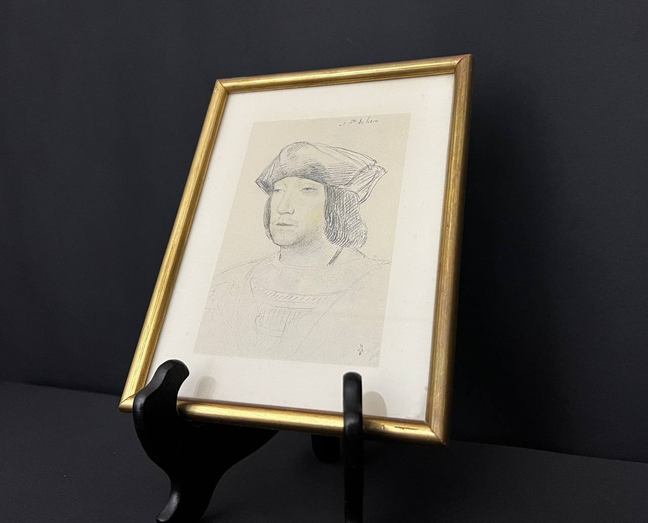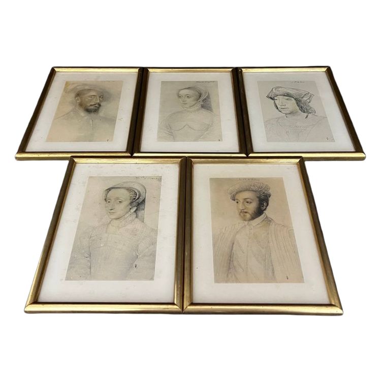 Set di 5 cornici antiche in legno dorato contenenti riproduzioni di ritratti di personaggi storici in stile rinascimentale. Belle incisioni con incorniciatura interna, presentazione elegante.