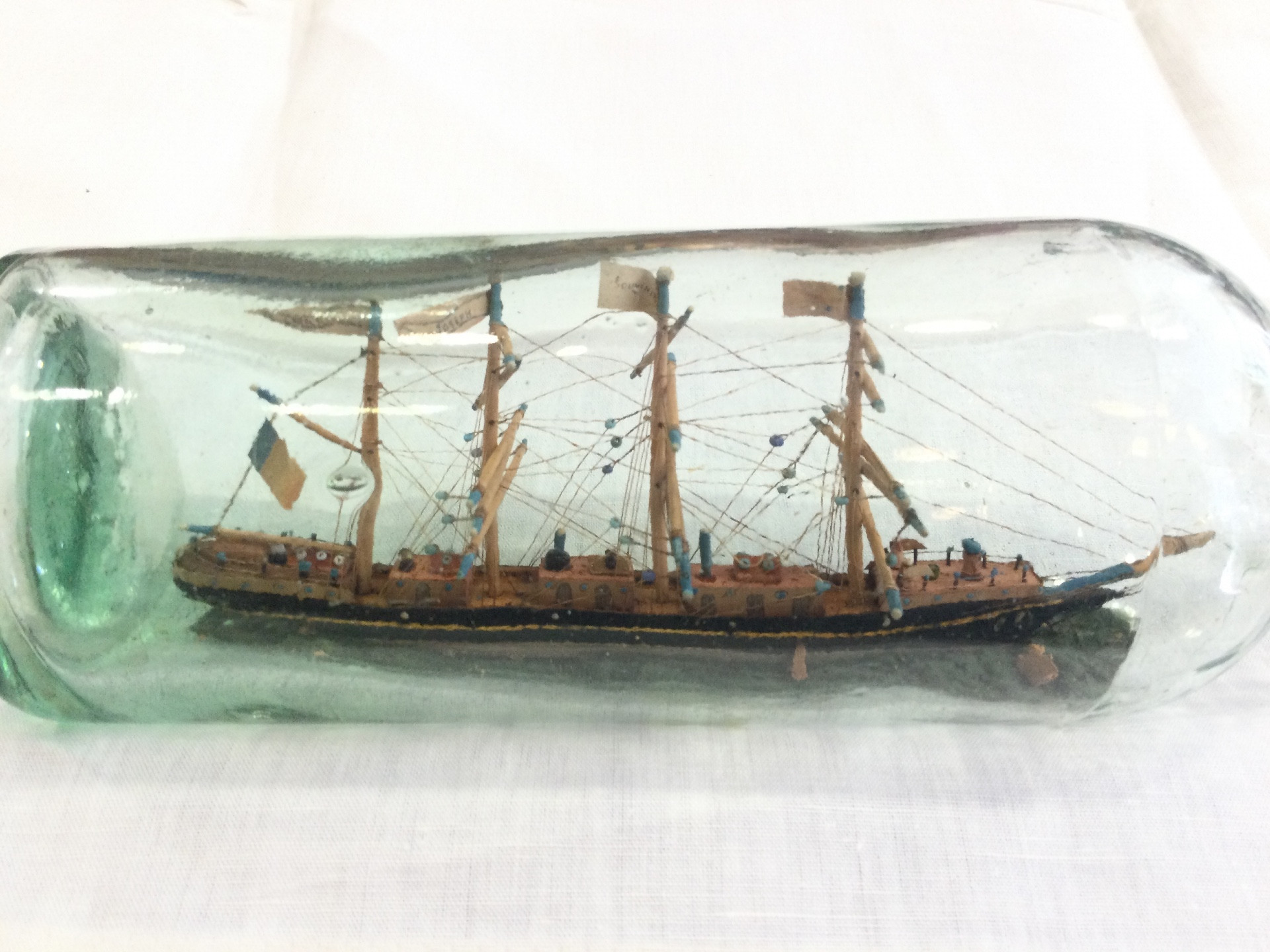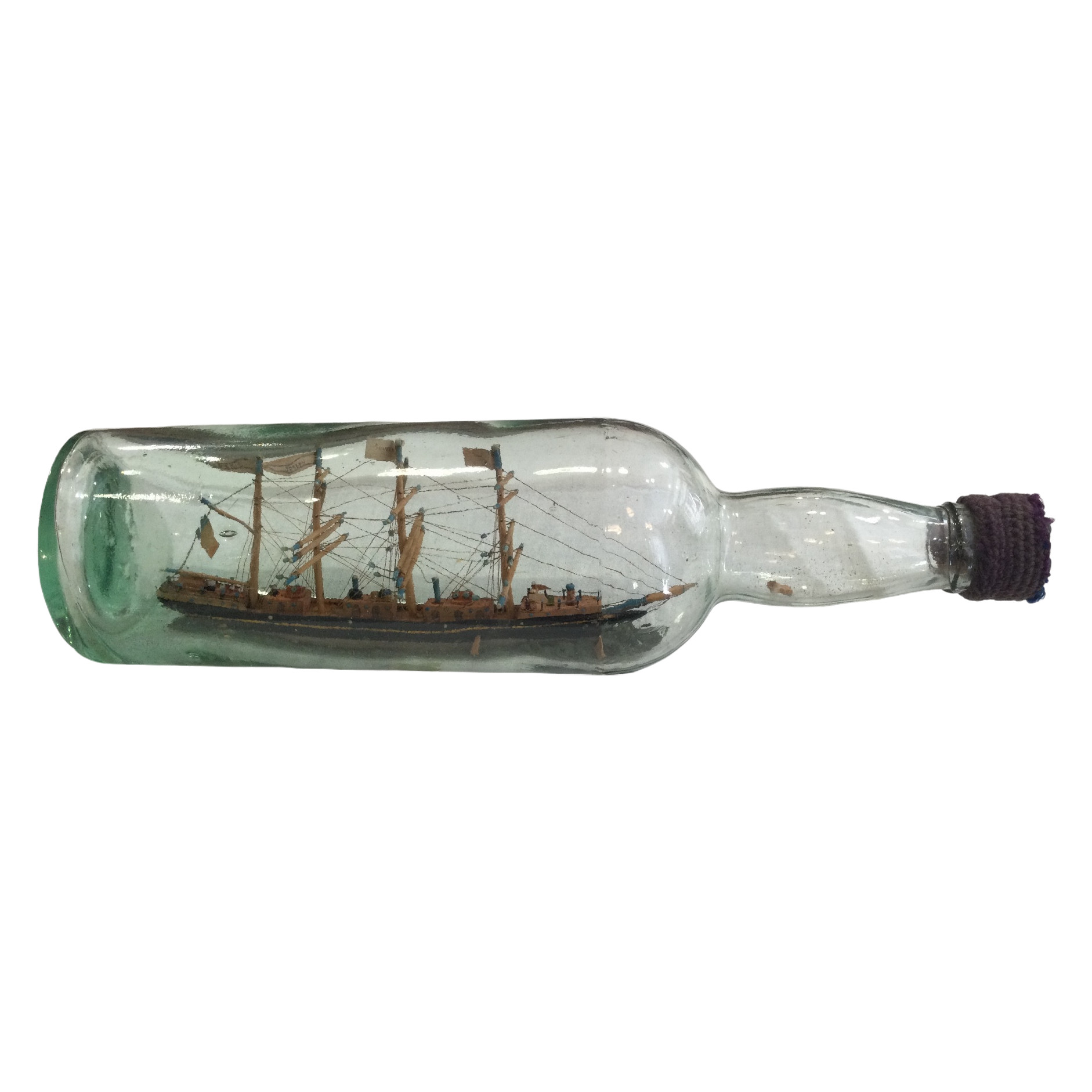 Souvenir della Marie-Joseph, una goletta affondata nel 1917. Opera marinara, arte popolare. Depositi di sughero nella bottiglia; il tappo di sughero si sta sgretolando dietro il cappuccio di lana. Condizioni generali molto buone. Inizi del XX secolo.