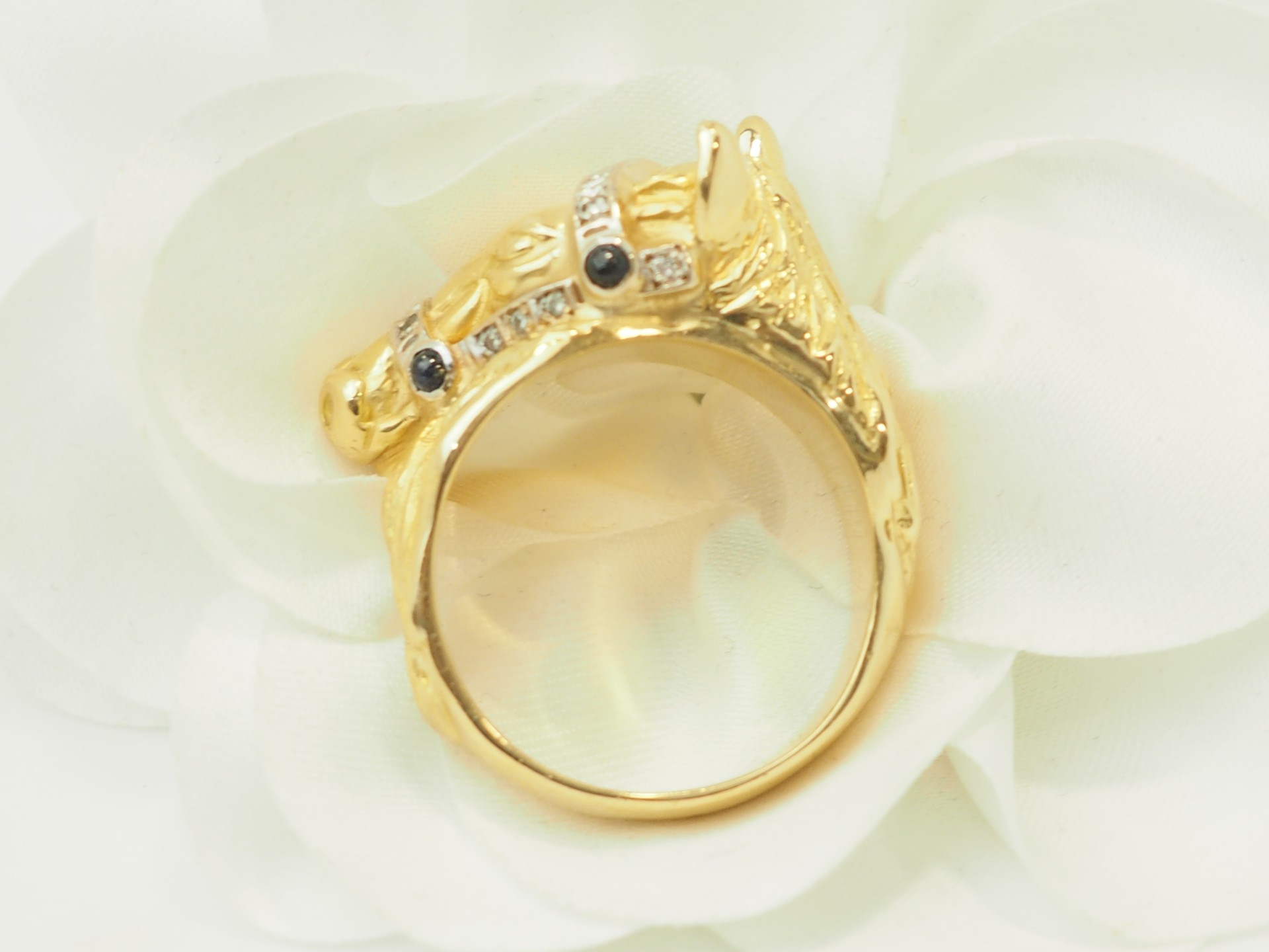Anello a forma di cavallo in oro giallo 18 carati, diamanti e zaffiri