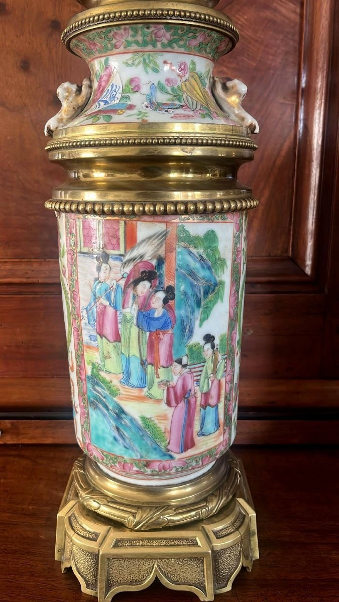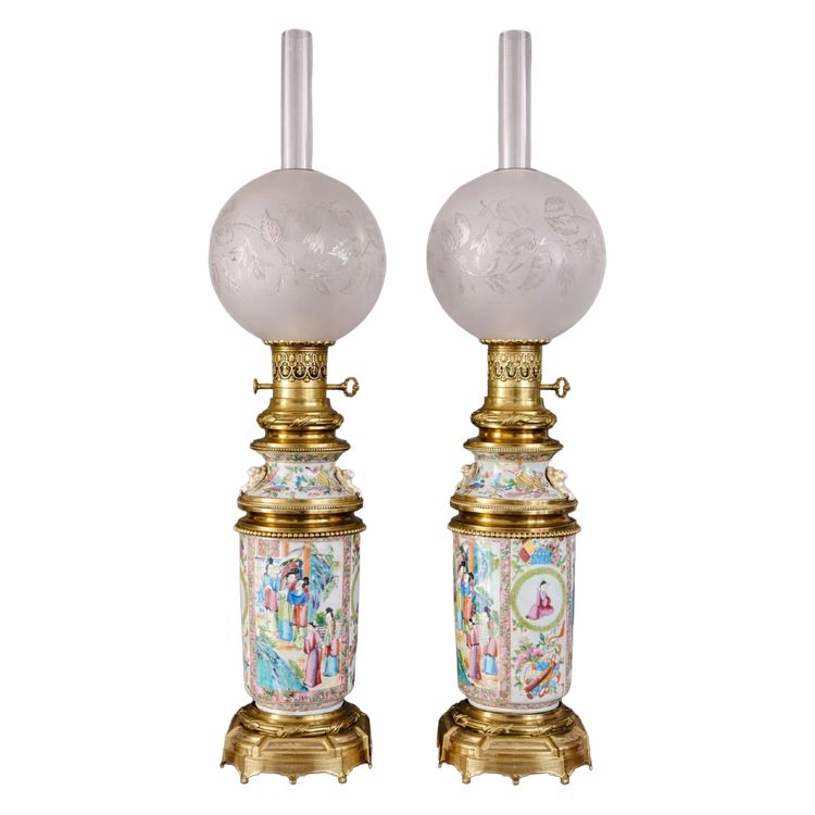 Queste lampade presentano decorazioni policrome tipiche della produzione di Canton, composte da scene di figure in paesaggi e motivi floreali e ornitologici, eseguiti con grande maestria.