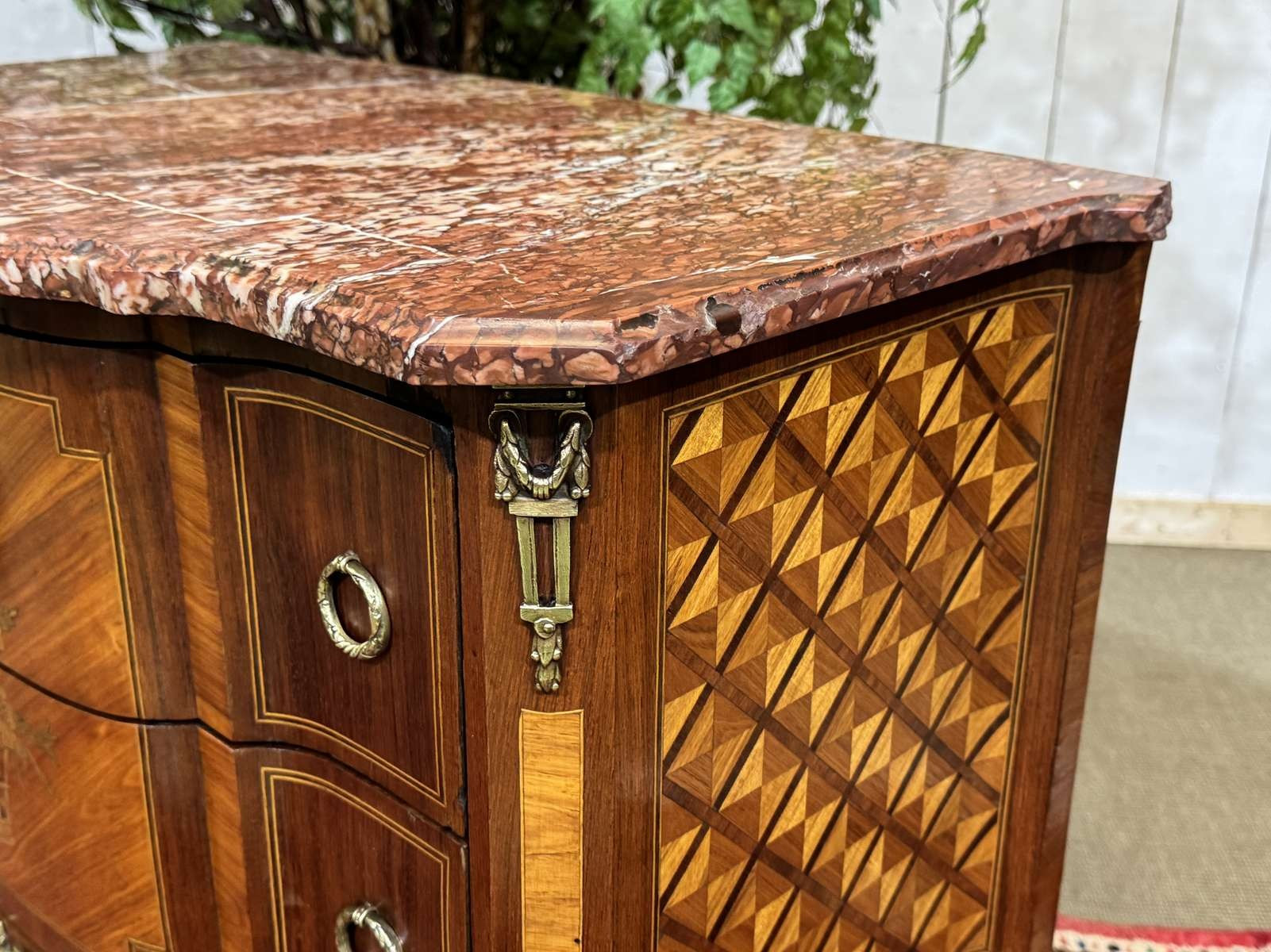 Comò in stile Luigi XV in palissandro, rovere e piano in marmo, risalente agli anni '30.