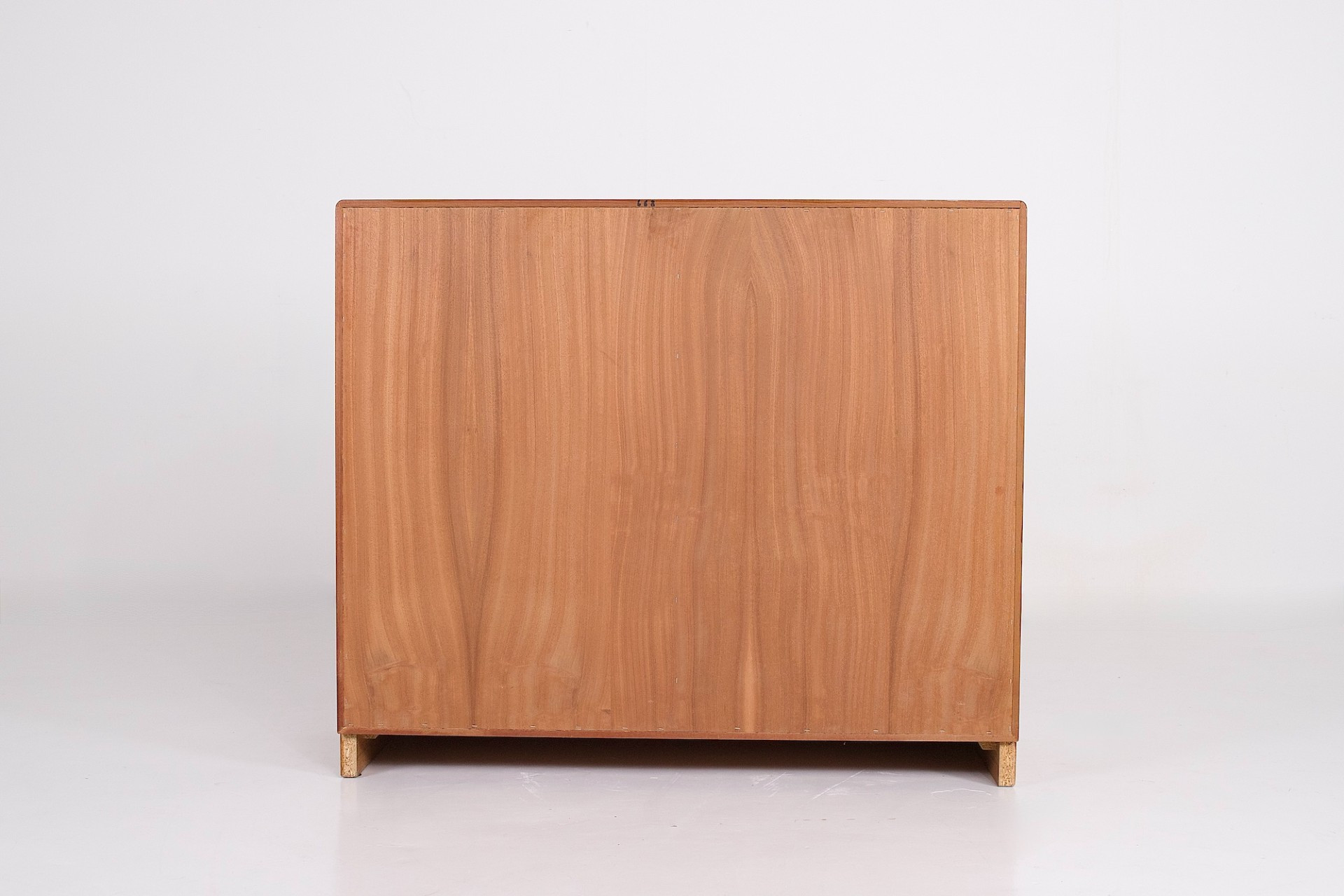 Credenza scandinava in teak su zoccolo, con sei cassetti a sinistra e un vano chiuso da un'anta a destra.