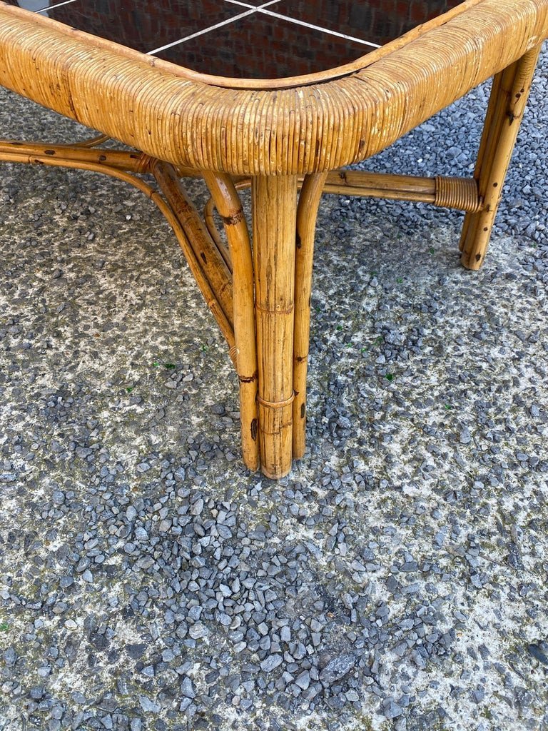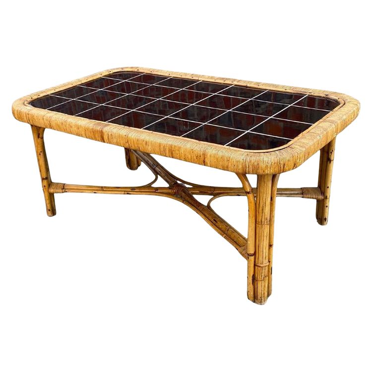 Tavolino da caffè di grandi dimensioni in rattan e piastrelle di ceramica, circa 1950/1960.